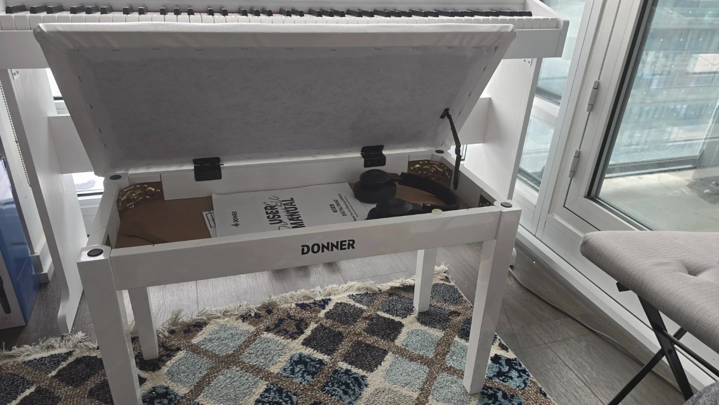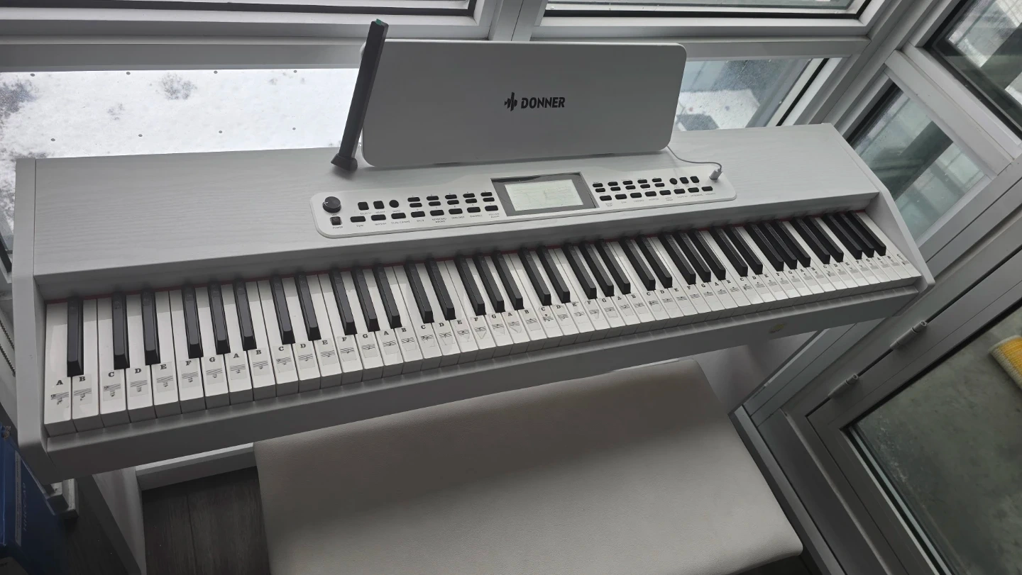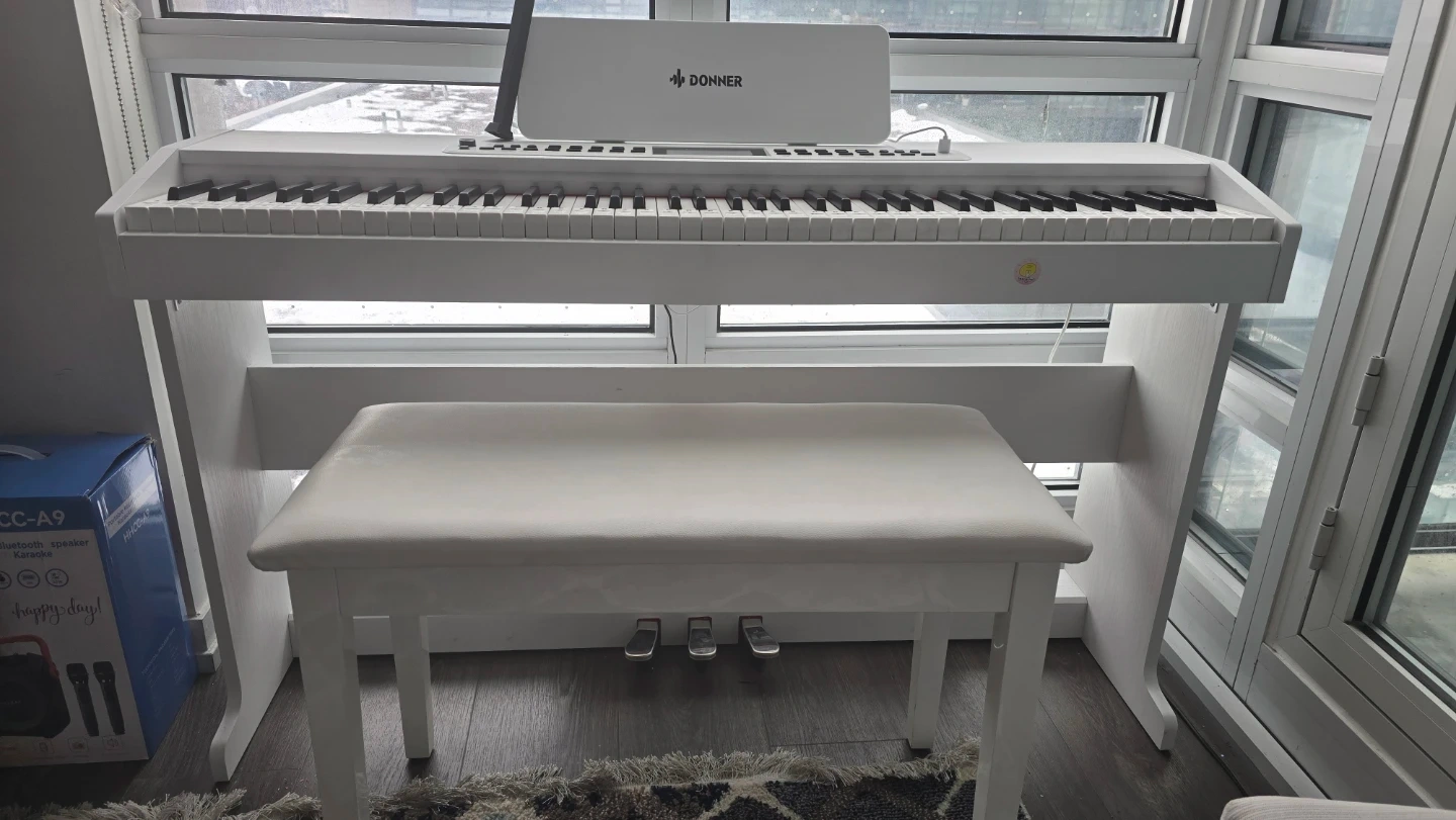 Selling a Donner DDP-95 digital piano in white, complete with a matching bench! This piano is perfect for beginners or experienced players looking for a compact and stylish instrument. It features weighted keys for a realistic feel and a variety of built-in sounds and rhythms. Comes with 3 pedals!