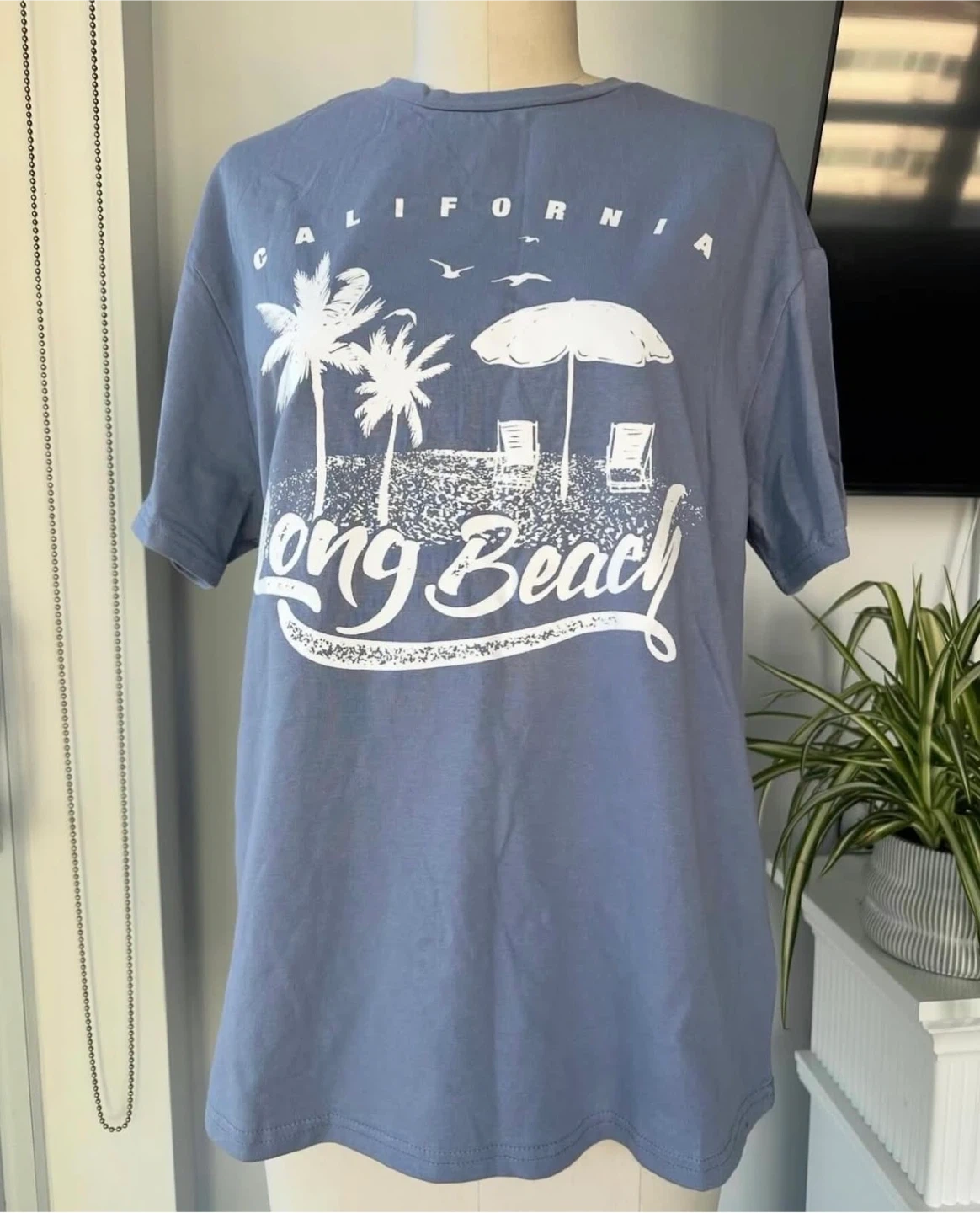 Graphic t-shirt featuring a "Long Beach California" design with palm trees and beach chairs. It's a comfortable, short-sleeved top. Cotton material.