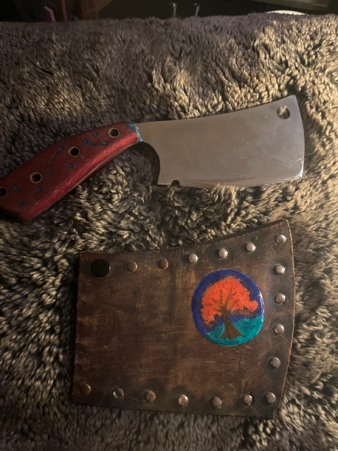 This is a handmade cleaver knife with a red and blue handle. It comes with a leather sheath featuring a painted tree design. Blade is stainless steel.