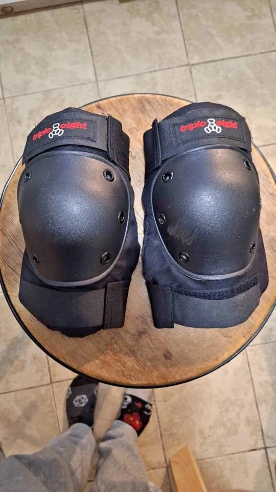 Protective Triple Eight elbow pads, size medium to large (M-L). Black color with hard shell protection. Worn twice, so very lightly used. Has adjustable velcro straps for secure fit. Great for skateboarding and rollerblading!