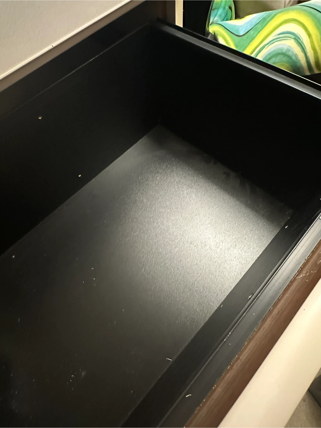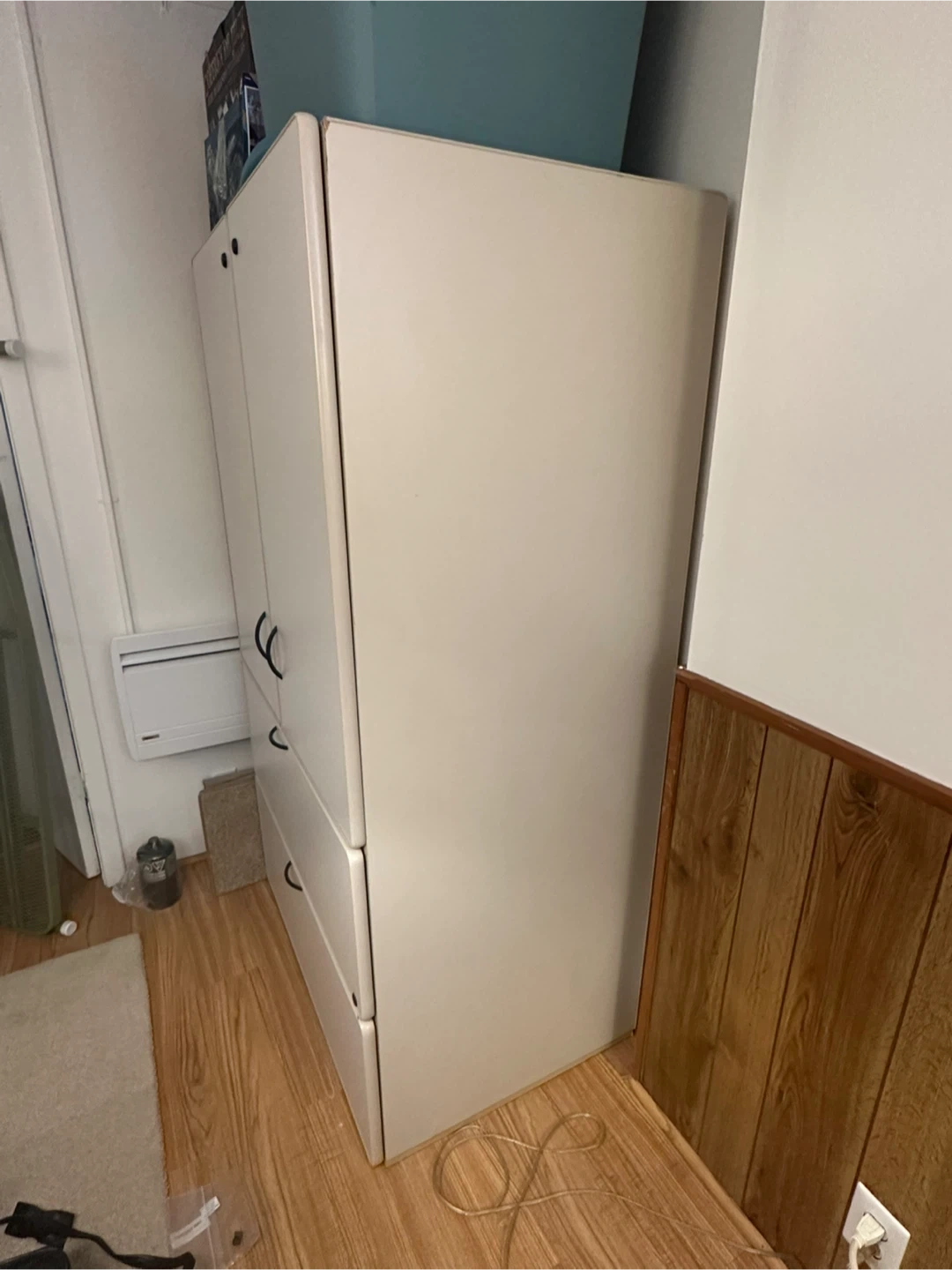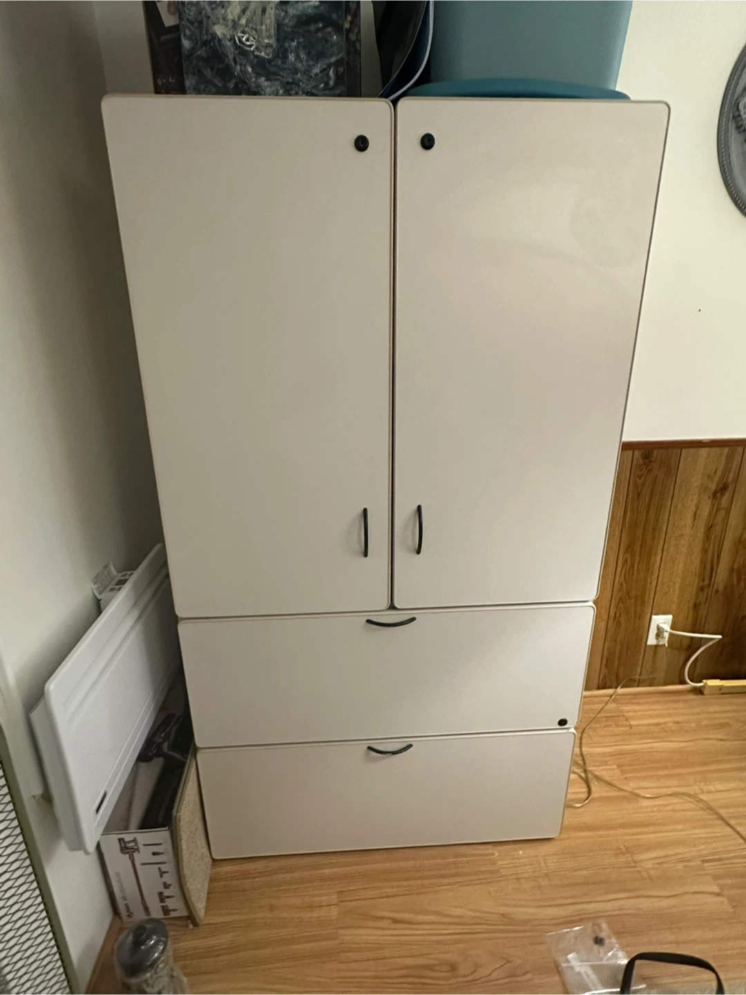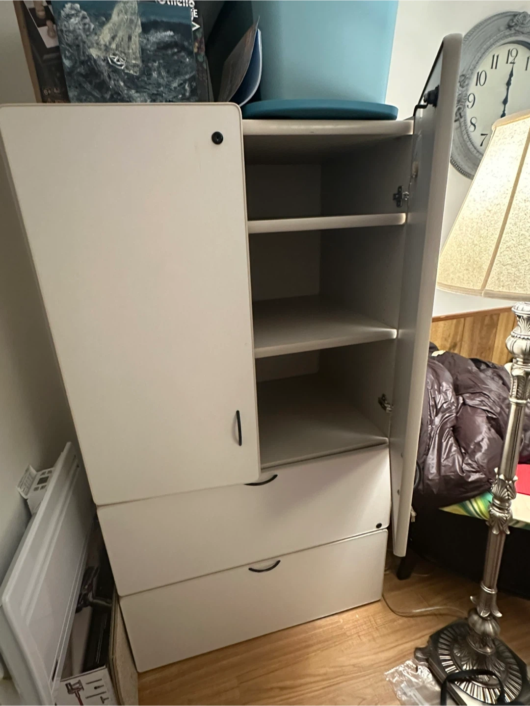 Light great storage cabinet featuring two doors and two drawers. It has several shelves inside for organization. This cabinet offers ample space for storing various items.