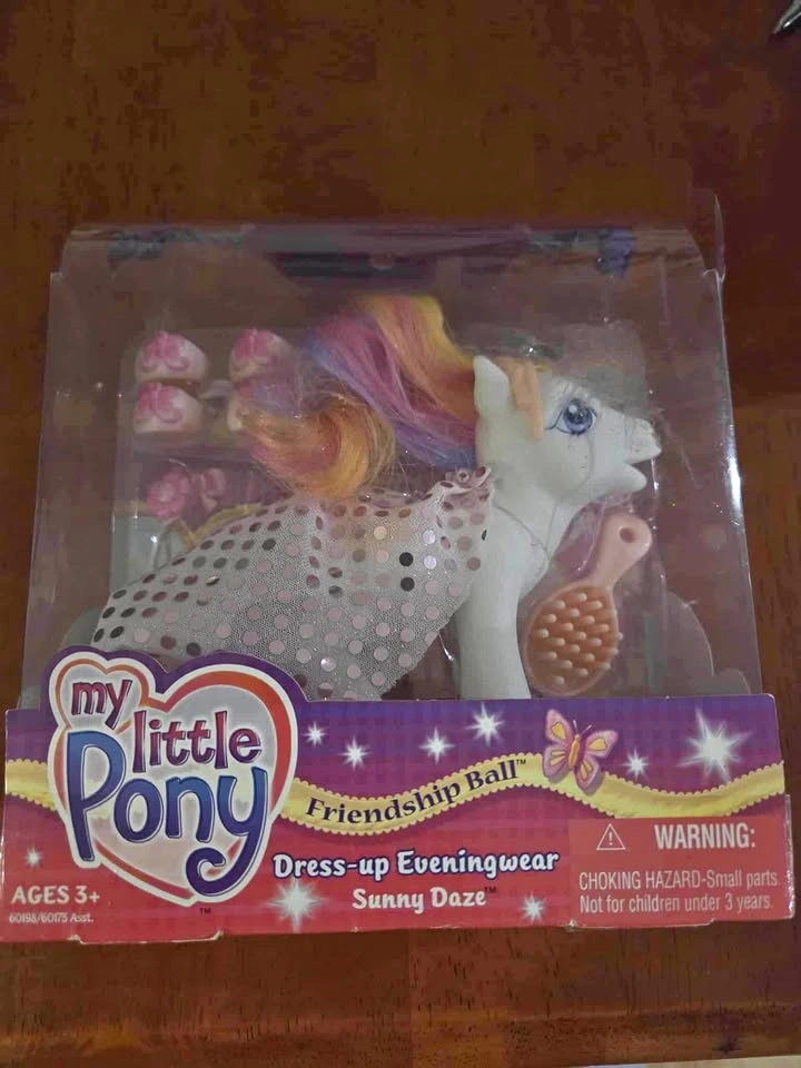 My Little Pony Sunny Daze toy in original packaging, including pony figure, tiara, cape, 4 shoes, pony tail elastic, and brush. Let me know if you're interested!
