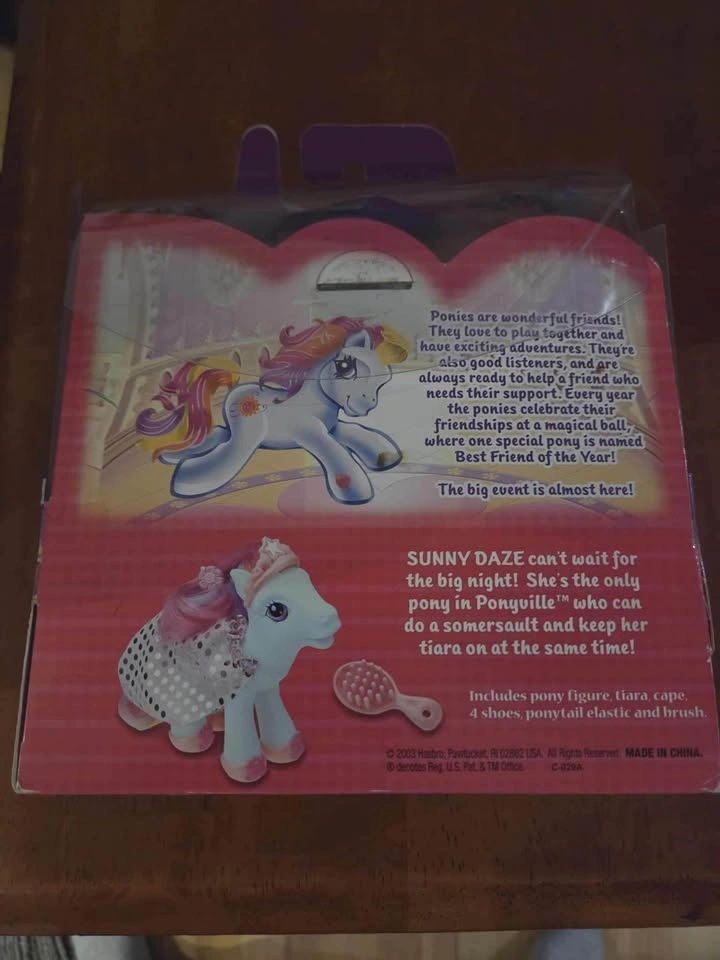 My Little Pony Sunny Daze toy in original packaging, including pony figure, tiara, cape, 4 shoes, pony tail elastic, and brush. Let me know if you're interested!