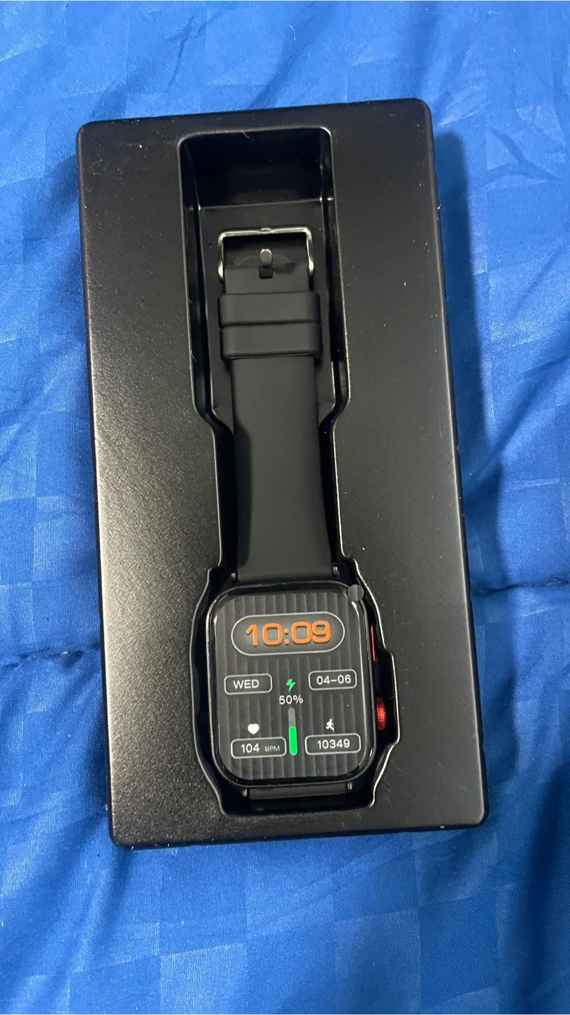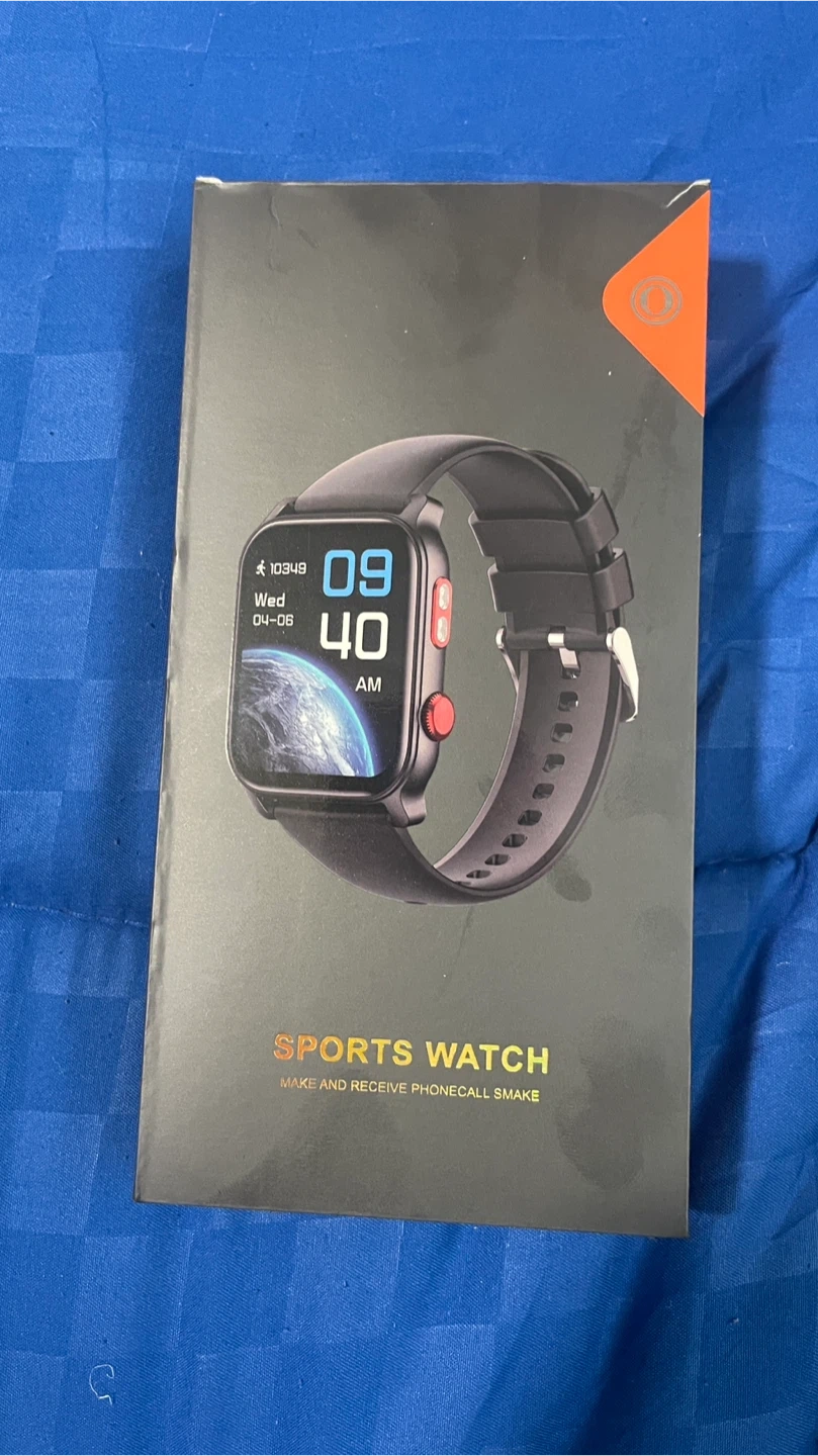 This sports watch allows you to make and receive phone calls. It includes the watch, a charging cable, and the original box. The display shows time, date, heart rate, and step count, ect.