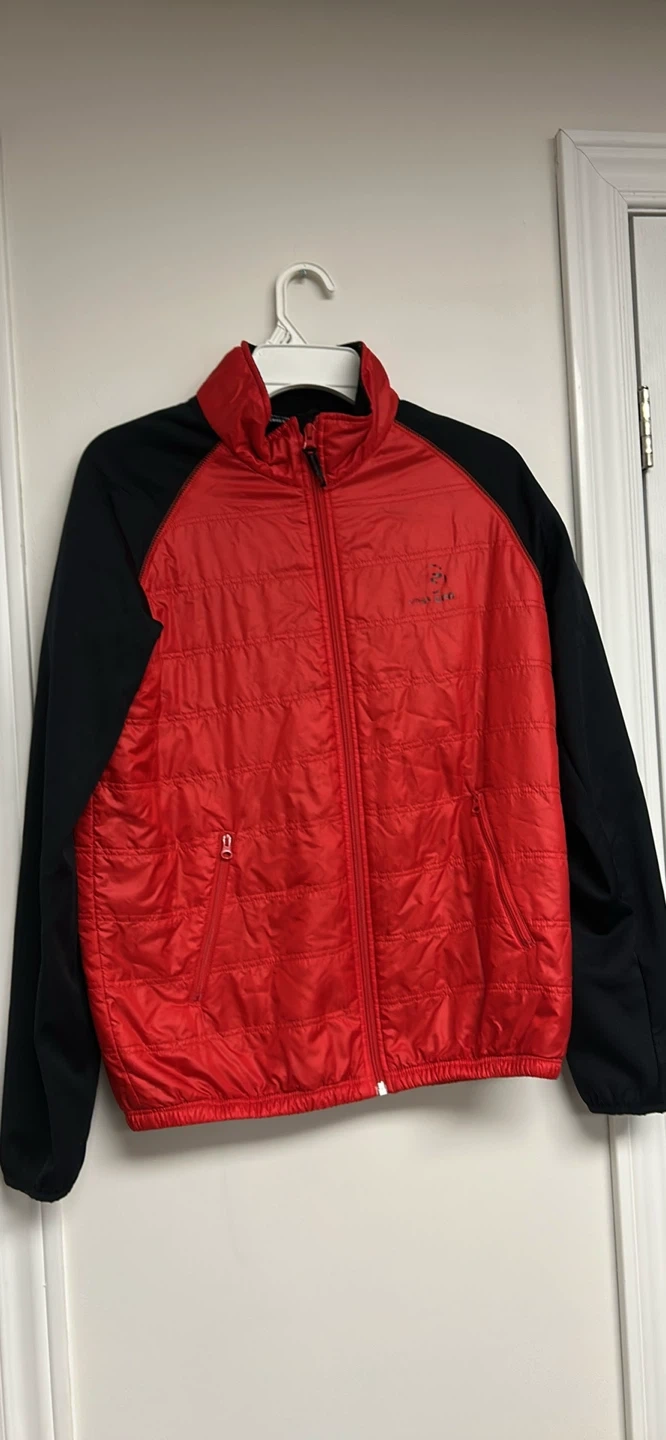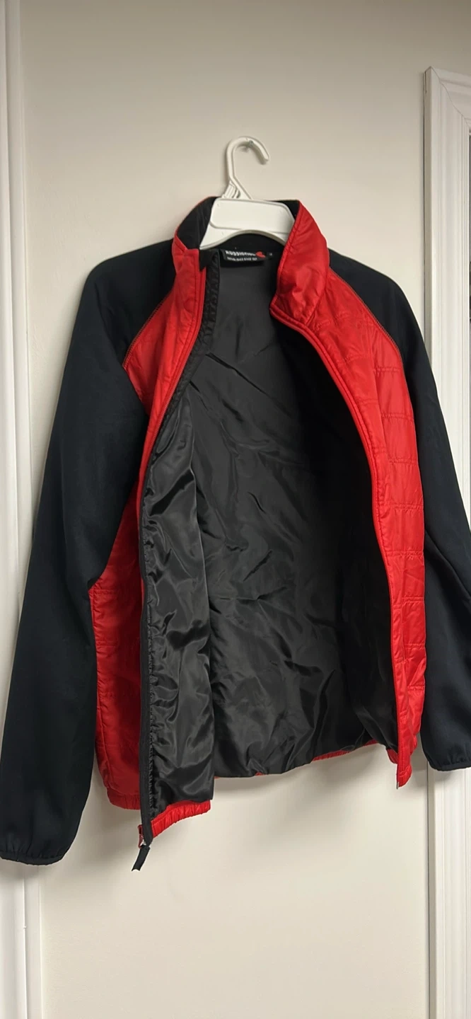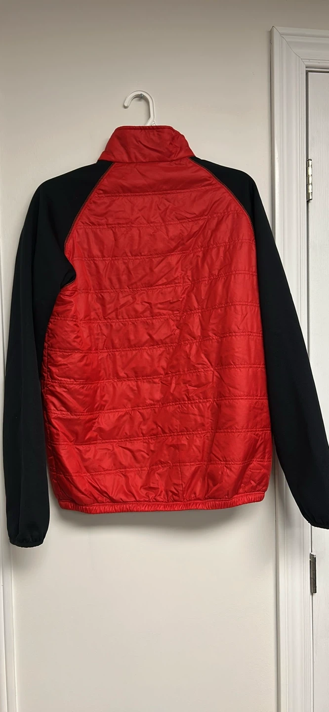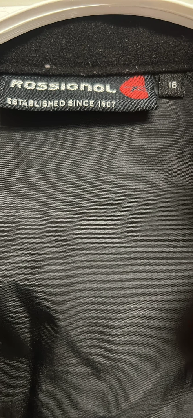 This is a red and black jacket from Rossignol. It's a size 16. The front and back panels are quilted, while the sleeves and collar are made of a soft, black material. It's suitable for cooler weather!
