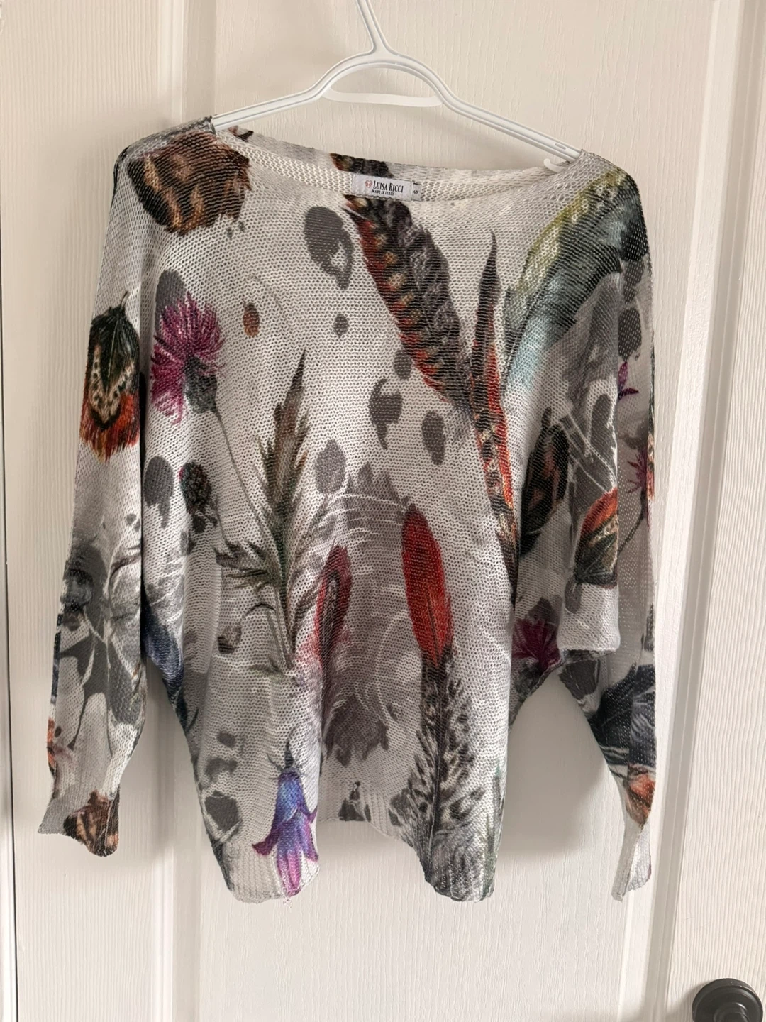 Lightweight knit sweater from Luisa Ricci with a vibrant feather and floral print. It's a unique piece with a casual, airy feel. This sweater is perfect for adding a touch of artistic flair to your everyday wardrobe.