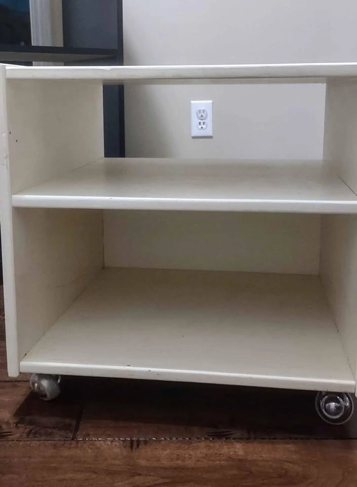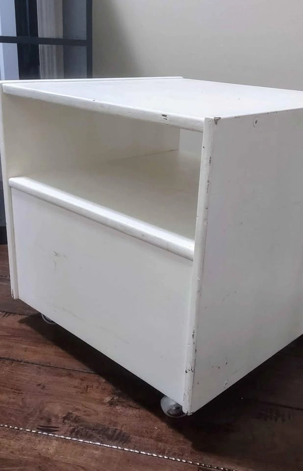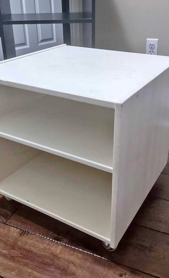15Solid wood. 19 ¾" cube. Great for a reclamation project or for a crafting/project area. Easily repaint it to use just about anywhere. A couple of knicks and minor stains, but sand and/or repaint it for like new appearance! Sits on 4 soft, quiet wheels. Smoke free, bug free, dog friendly home.