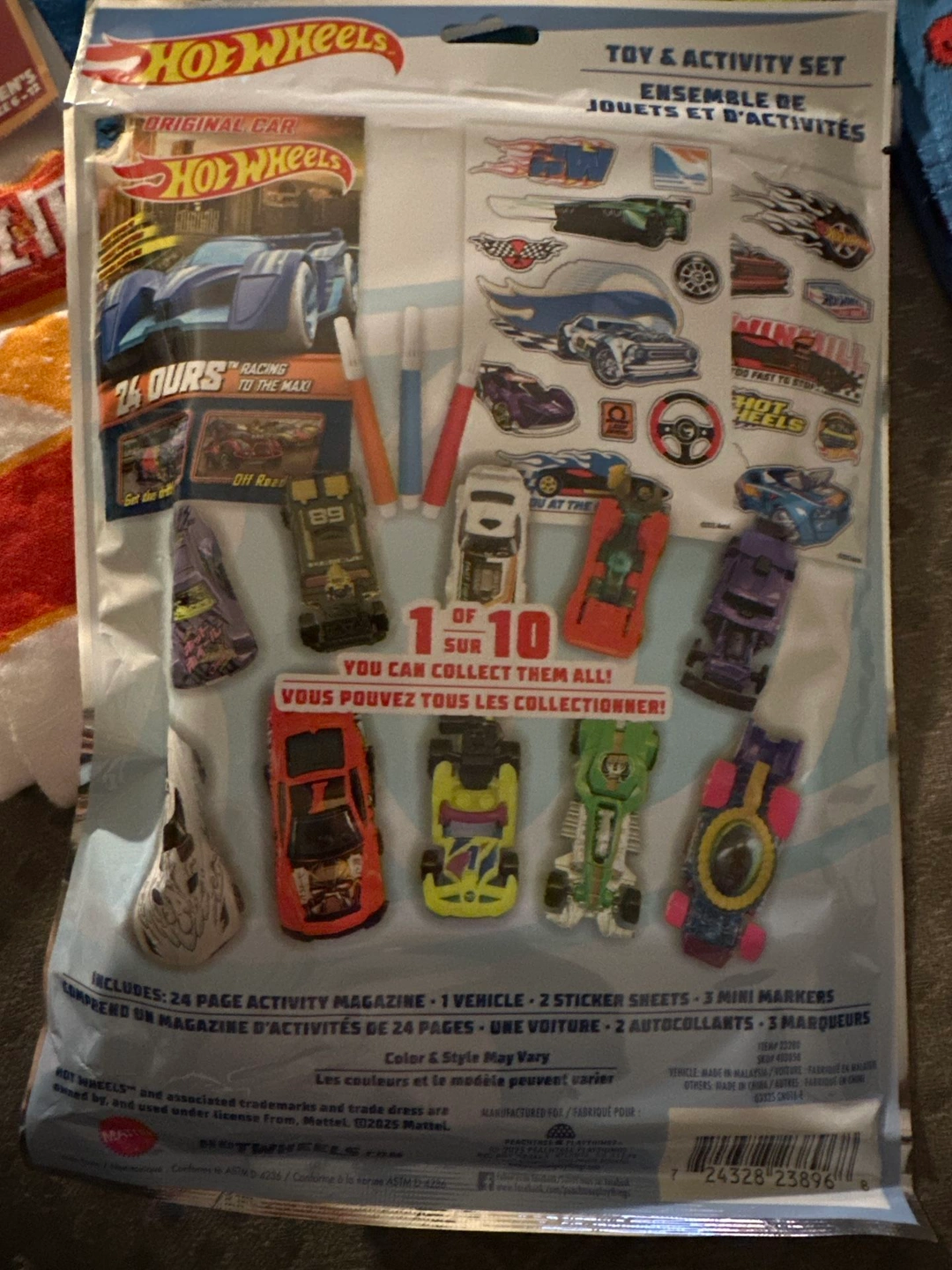 Brand new Hot Wheels Toy & Activity Set! Includes a 24-page activity magazine, 1 vehicle, 2 sticker sheets, and 3 mini markers. Perfect for any Hot Wheels fan!