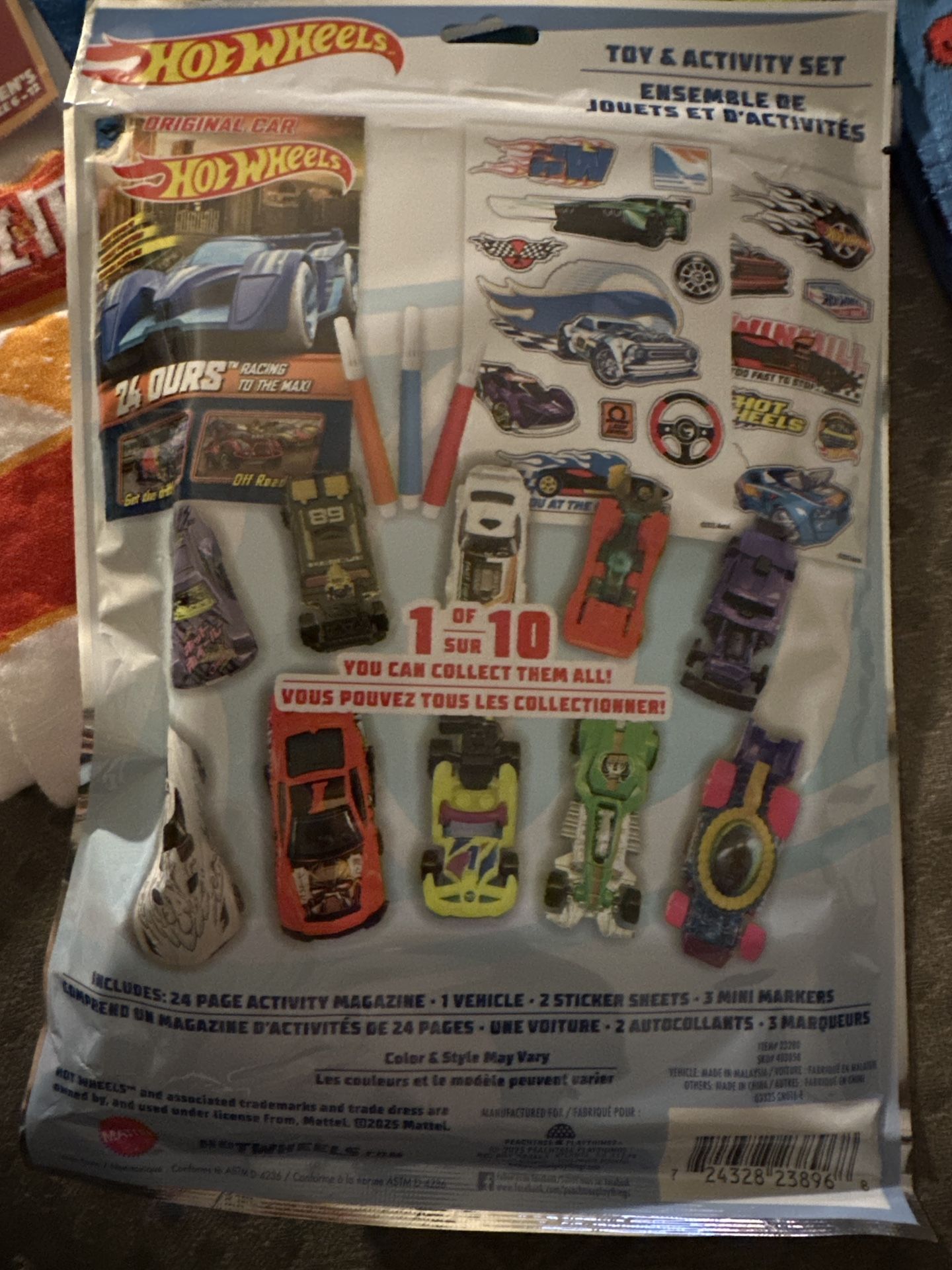 Brand new Hot Wheels Toy & Activity Set! Includes a 24-page activity magazine, 1 vehicle, 2 sticker sheets, and 3 mini markers. Perfect for any Hot Wheels fan!