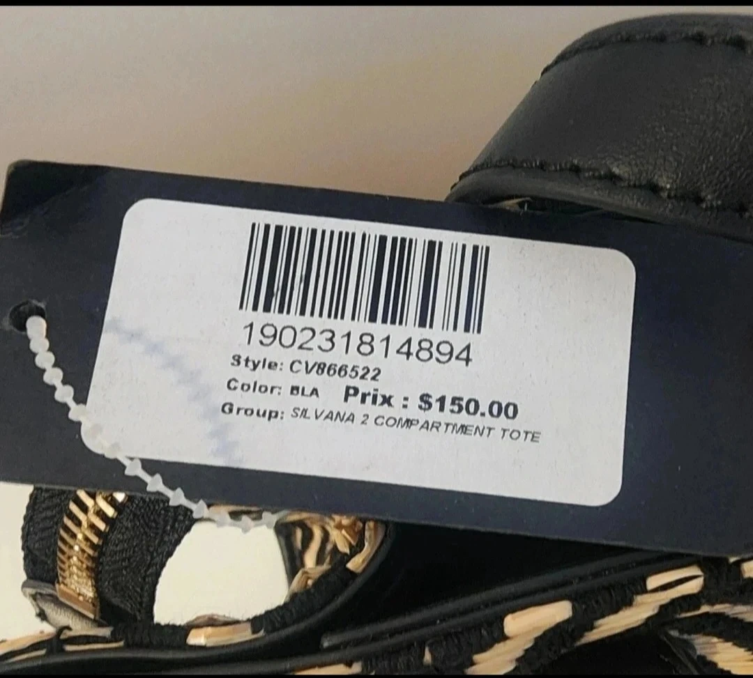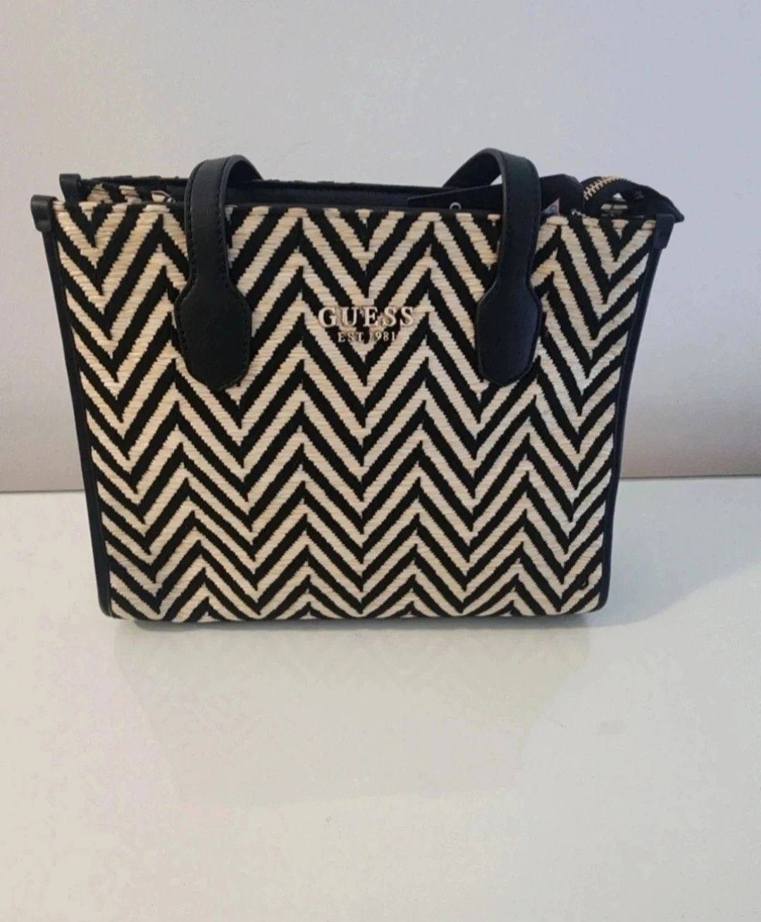 This GUESS tote bag features a black and white chevron pattern with black faux leather accents. It's a medium-sized bag with a zippered closure. Comes with original tags and is still in its plastic packaging.