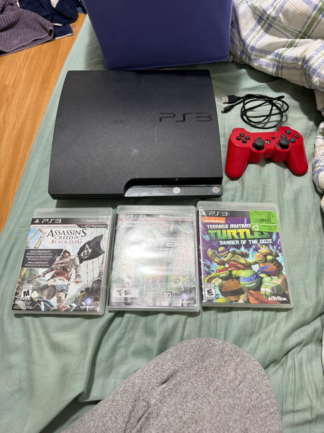 This bundle includes a Sony PlayStation 3 console, a red controller, and three games: Assassin's Creed IV: Black Flag, Tom Clancy's Splinter Cell: Trilogy, and Teenage Mutant Ninja Turtles: Out of the Shadows. A USB charging cable is also included.