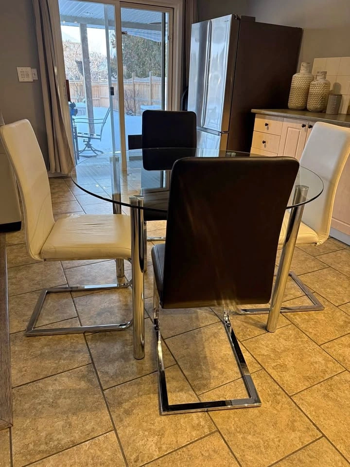 Modern round glass dining table with sleek silver metallic legs, paired with leather chairs with matching silver metal bases. Very minimally used and kept in a basement. Glass has very minor scratches. Selling ASAP to make space for a new dining set. Asking $275