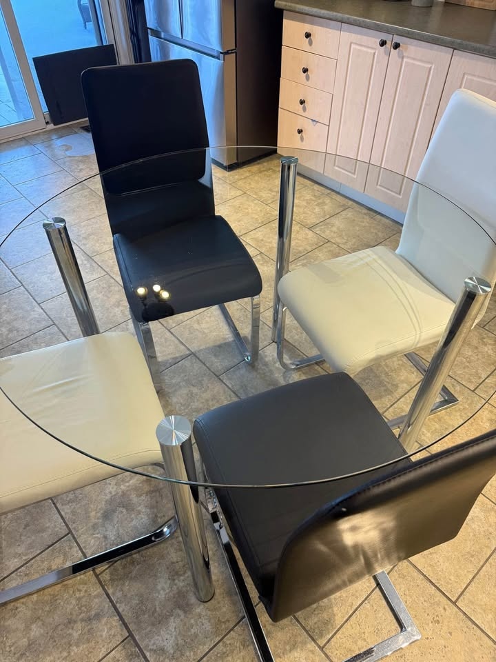 Modern round glass dining table with sleek silver metallic legs, paired with leather chairs with matching silver metal bases. Very minimally used and kept in a basement. Glass has very minor scratches. Selling ASAP to make space for a new dining set. Asking $275