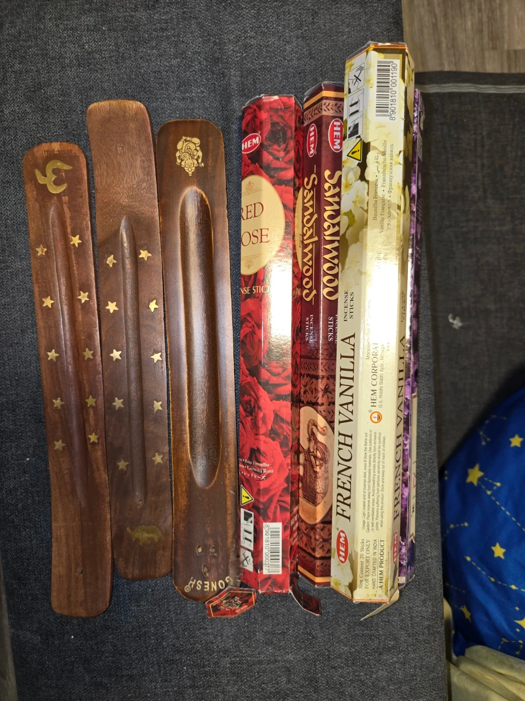 Includes several wooden incense stick holders, some with decorative star and moon designs. Also includes HEM brand incense sticks in French Vanilla, Sandalwood, and Red Rose scents. Incense stick boxes contain 20 sticks each.