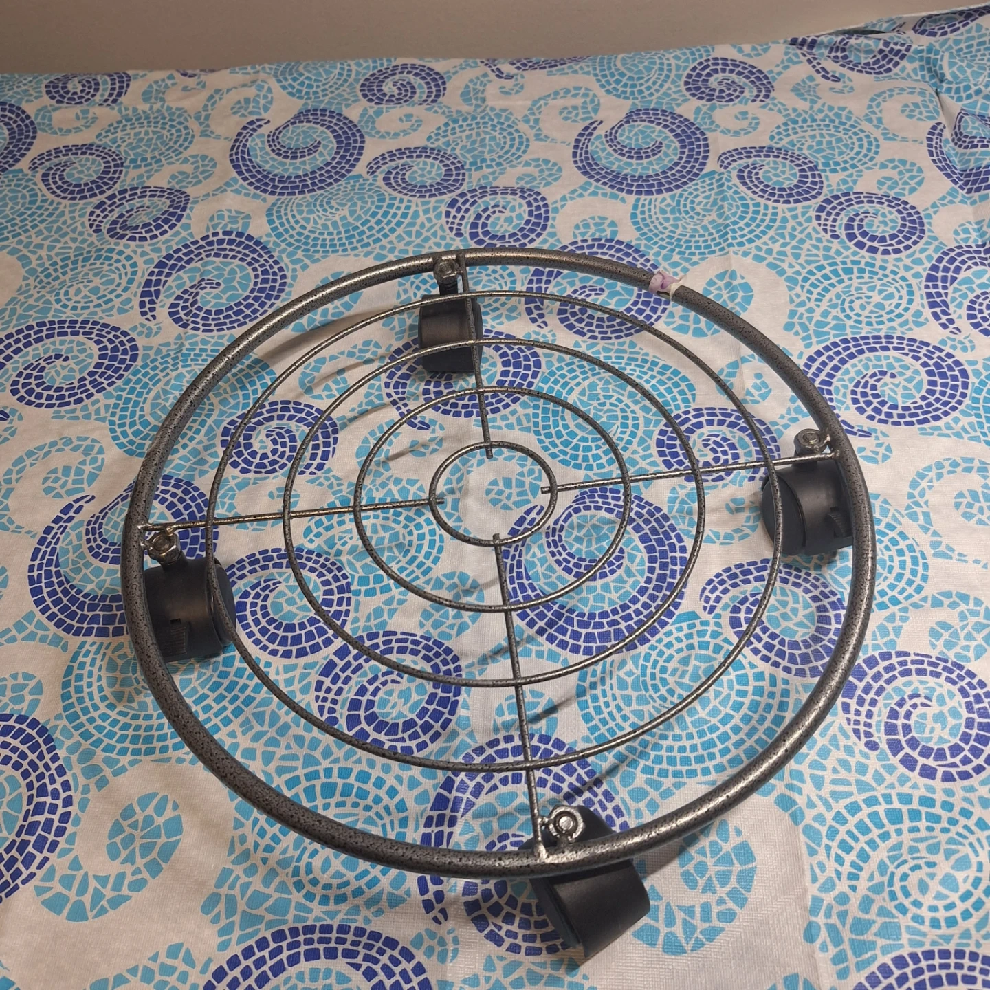 Round metal plant stand on casters. It's constructed from durable metal with a grey finish. The stand has four wheels for easy movement of potted plants. This caddy is useful for relocating heavy planters around your home or garden.
