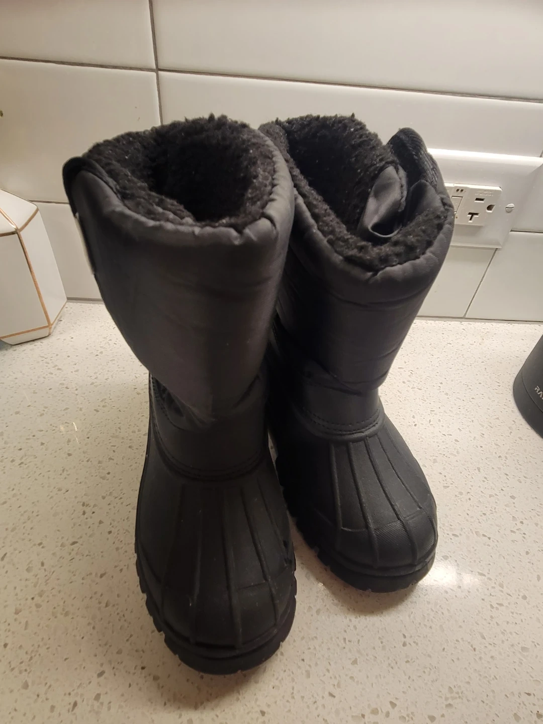 These black winter snow boots are lined with soft fleece for extra warmth. They have a sturdy, slip-resistant sole for traction. This pair is a size 12. They're perfect for keeping feet dry and cozy during cold weather activities!