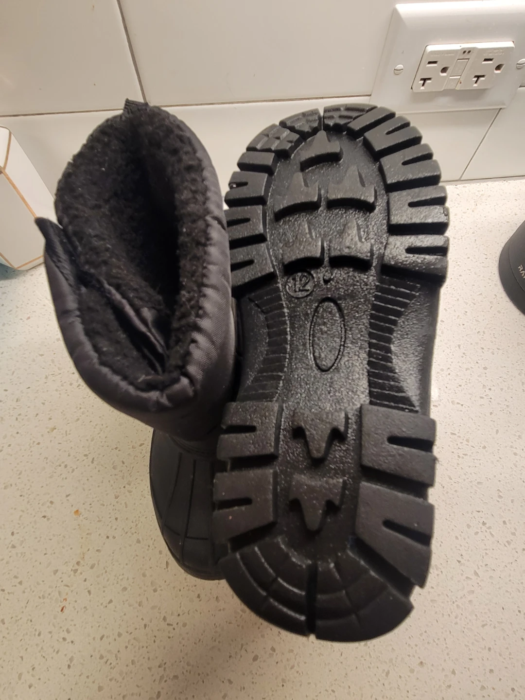 These black winter snow boots are lined with soft fleece for extra warmth. They have a sturdy, slip-resistant sole for traction. This pair is a size 12. They're perfect for keeping feet dry and cozy during cold weather activities!