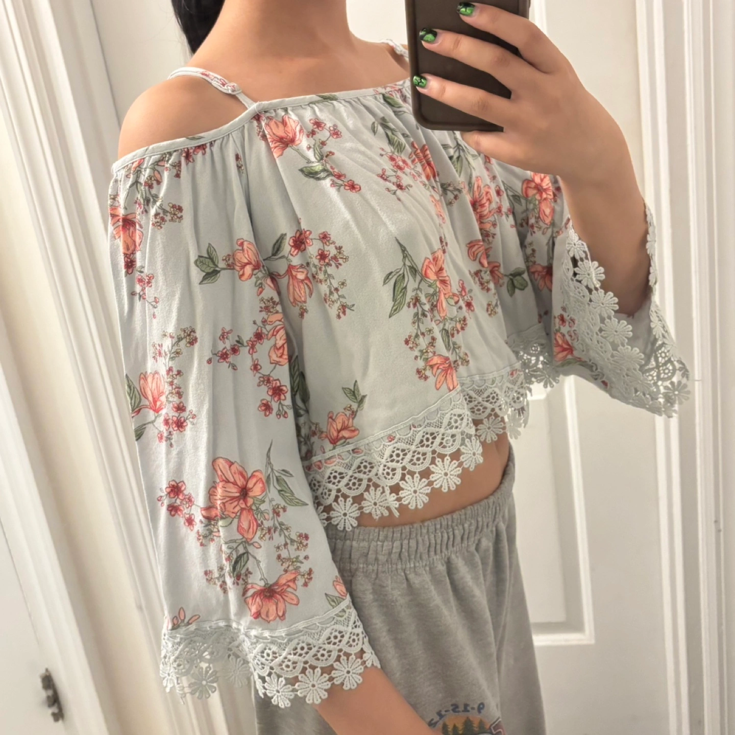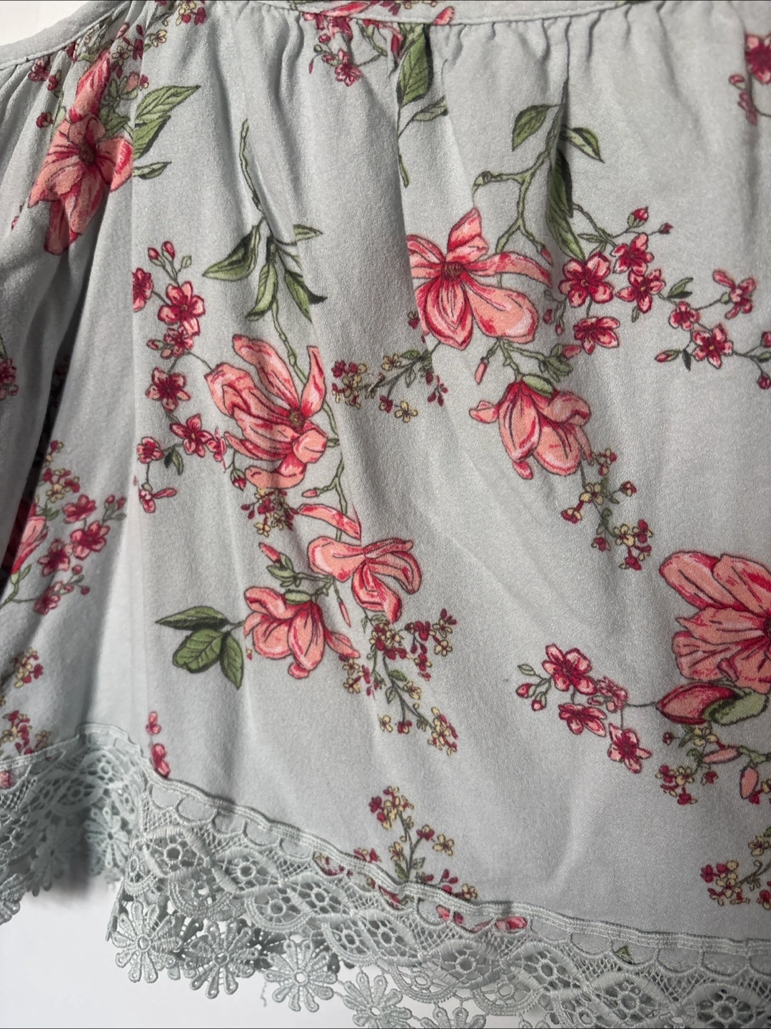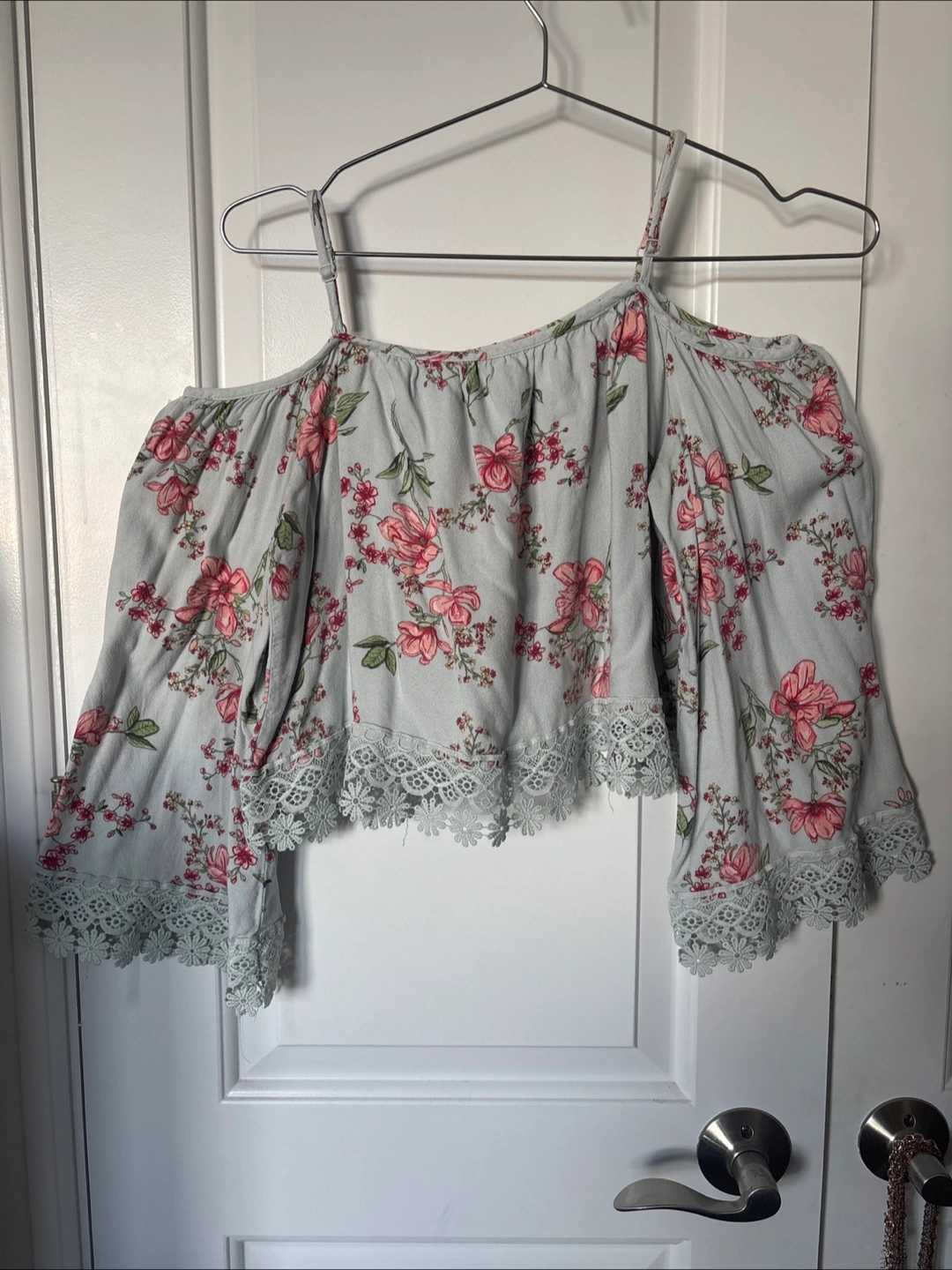 Light blue floral print, cold shoulder top. Bell sleeves and lace trim. Perfect for summer Size 8 (Small)