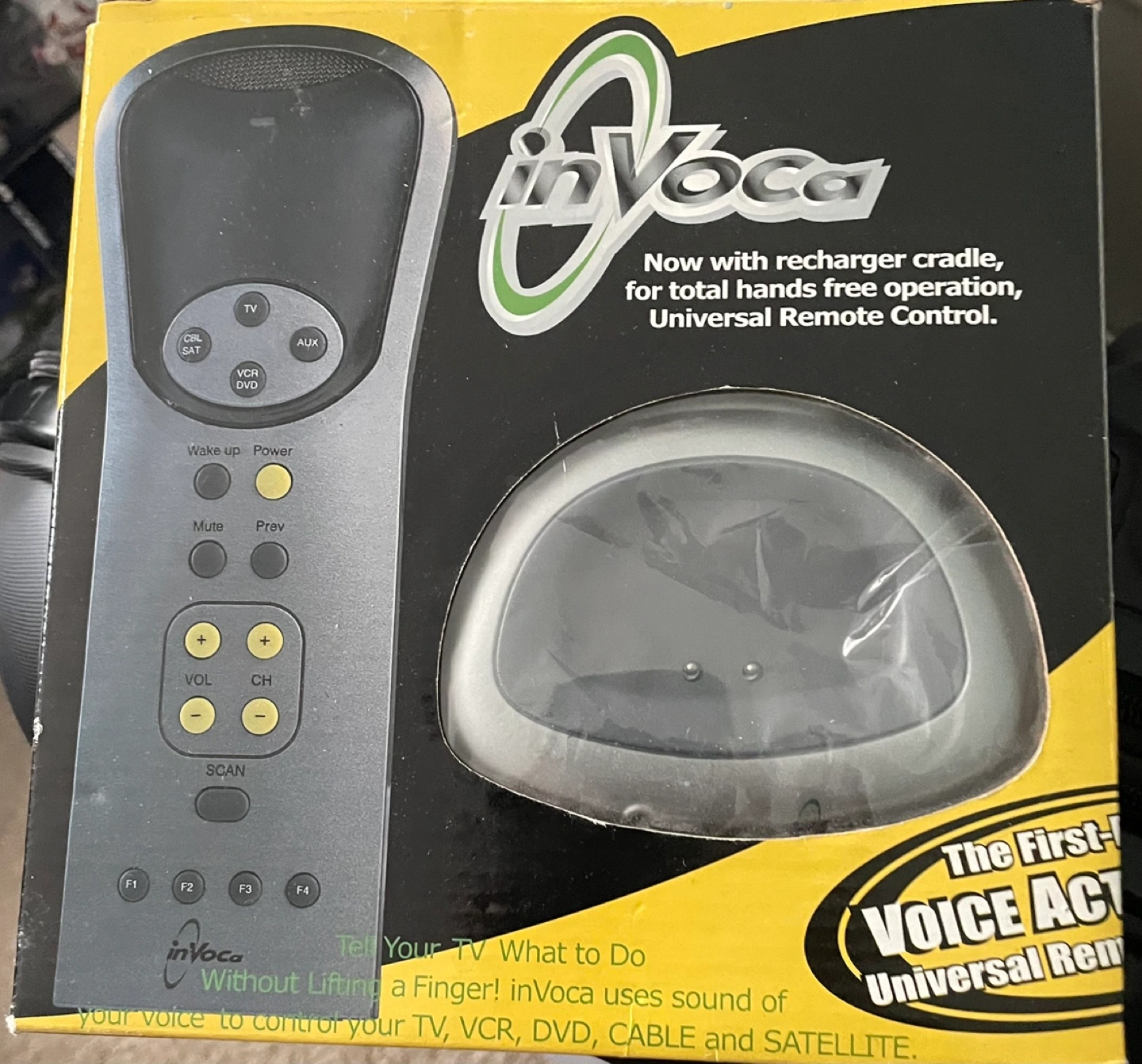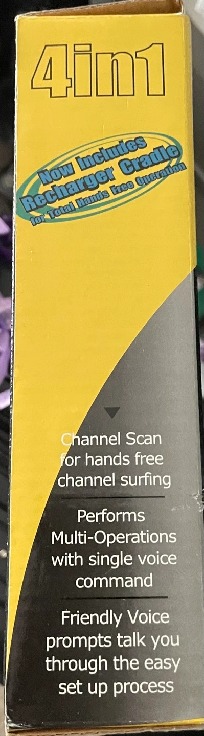 Voice activated remote control, comes with charging cradle. Controls TV, VCR, DVD, Cable, and Satellite. NIB