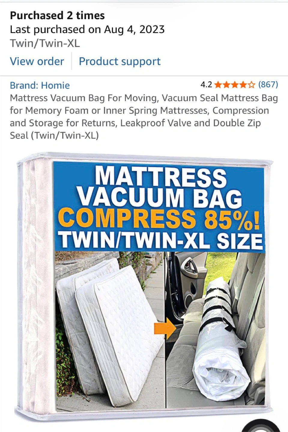 This mattress vacuum bag by Homie is designed for moving and storage. It's suitable for memory foam or inner spring mattresses and offers compression. The bag features a leakproof valve and double zip seal for secure closure.
