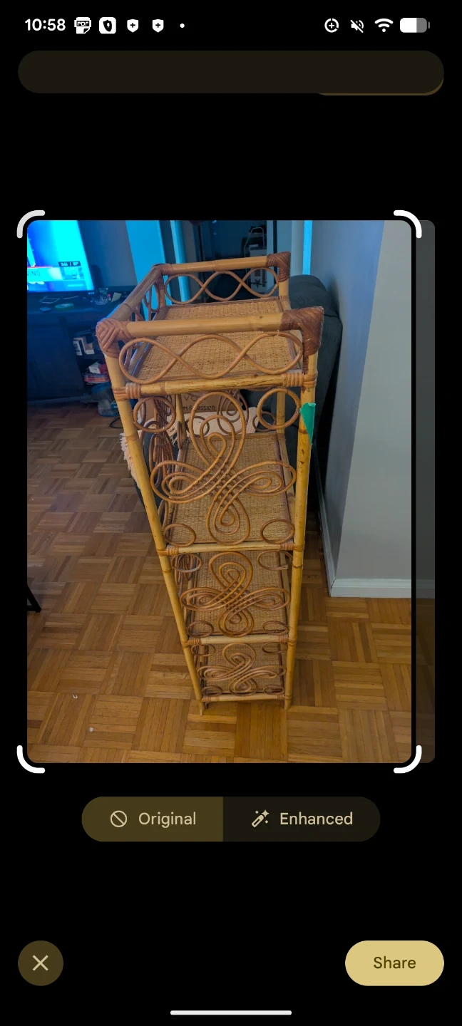 This tall shelf unit is made from bamboo with intricate scrollwork details. It's perfect for displaying plants or decorative items. The material is woven bamboo.