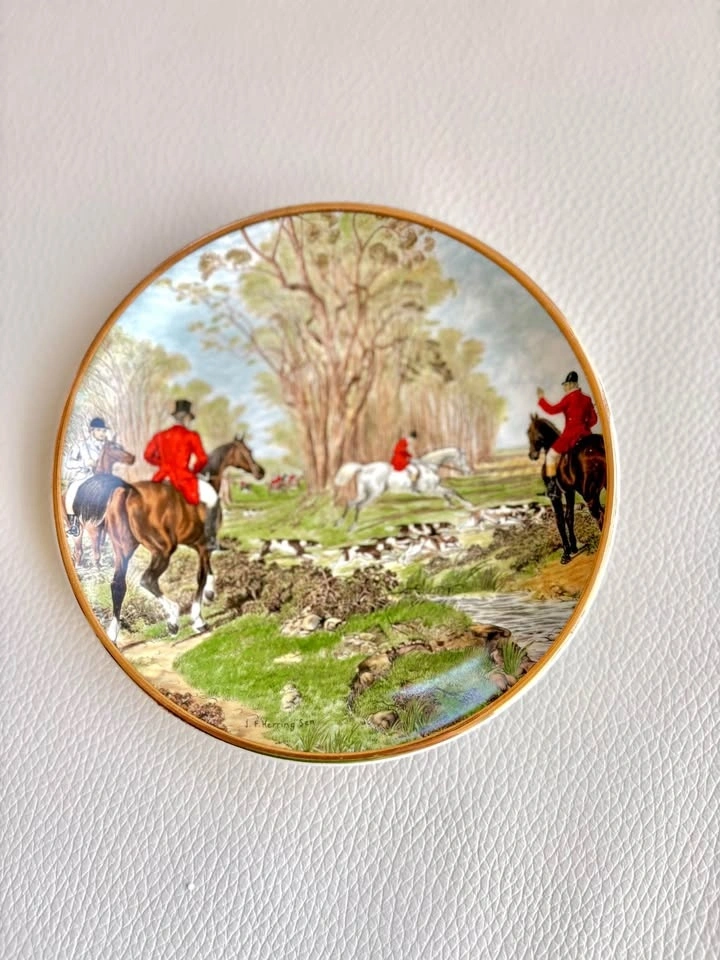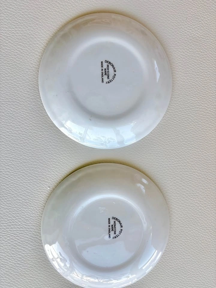 Charming pair of Debonair Pottery Ironstone plates, made in England. One plate features a fox hunt scene with horses and hounds. The other plate has a lovely pastoral scene with people, a wagon, and a horse. Each plate has a 5-inch diameter. Please check my other listings for more items. Bundle discounts are available.