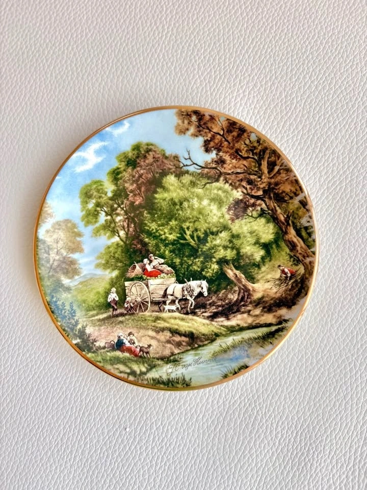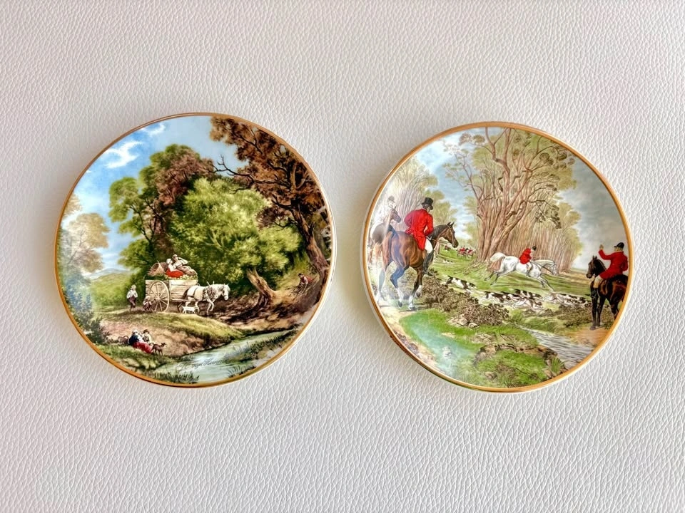 Charming pair of Debonair Pottery Ironstone plates, made in England. One plate features a fox hunt scene with horses and hounds. The other plate has a lovely pastoral scene with people, a wagon, and a horse. Each plate has a 5-inch diameter. Please check my other listings for more items. Bundle discounts are available.