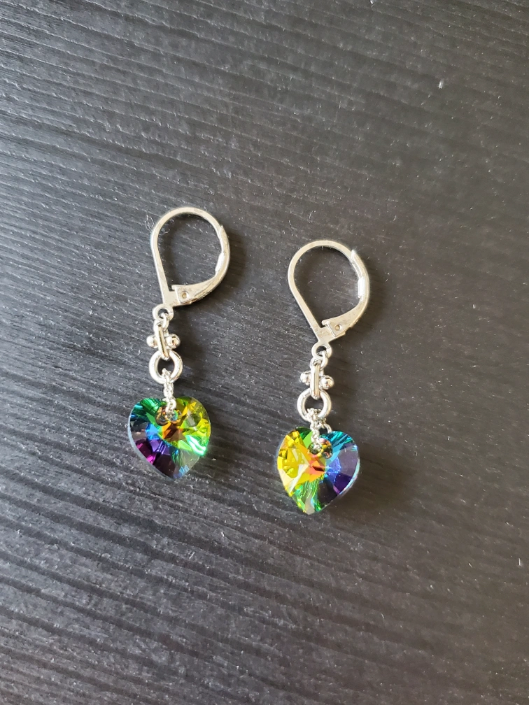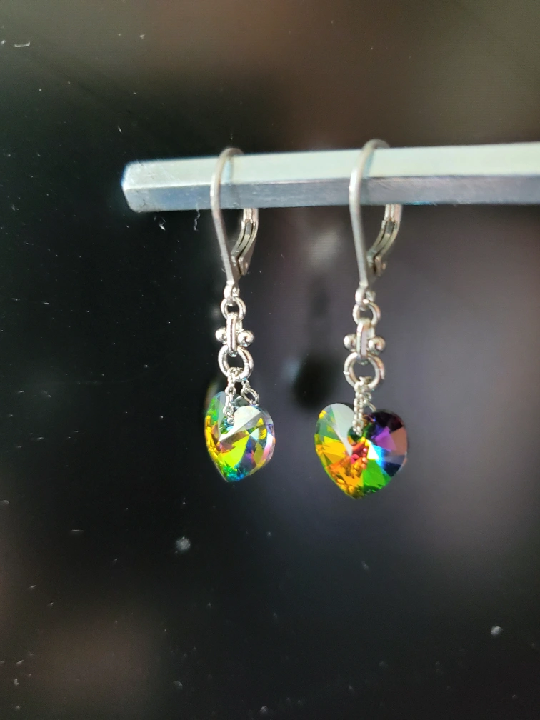 These are some super cute heart-shaped crystal dangle earrings! They have a rainbow/iridescent effect that catches the light beautifully. Perfect for adding a little sparkle to any outfit! Never worn.