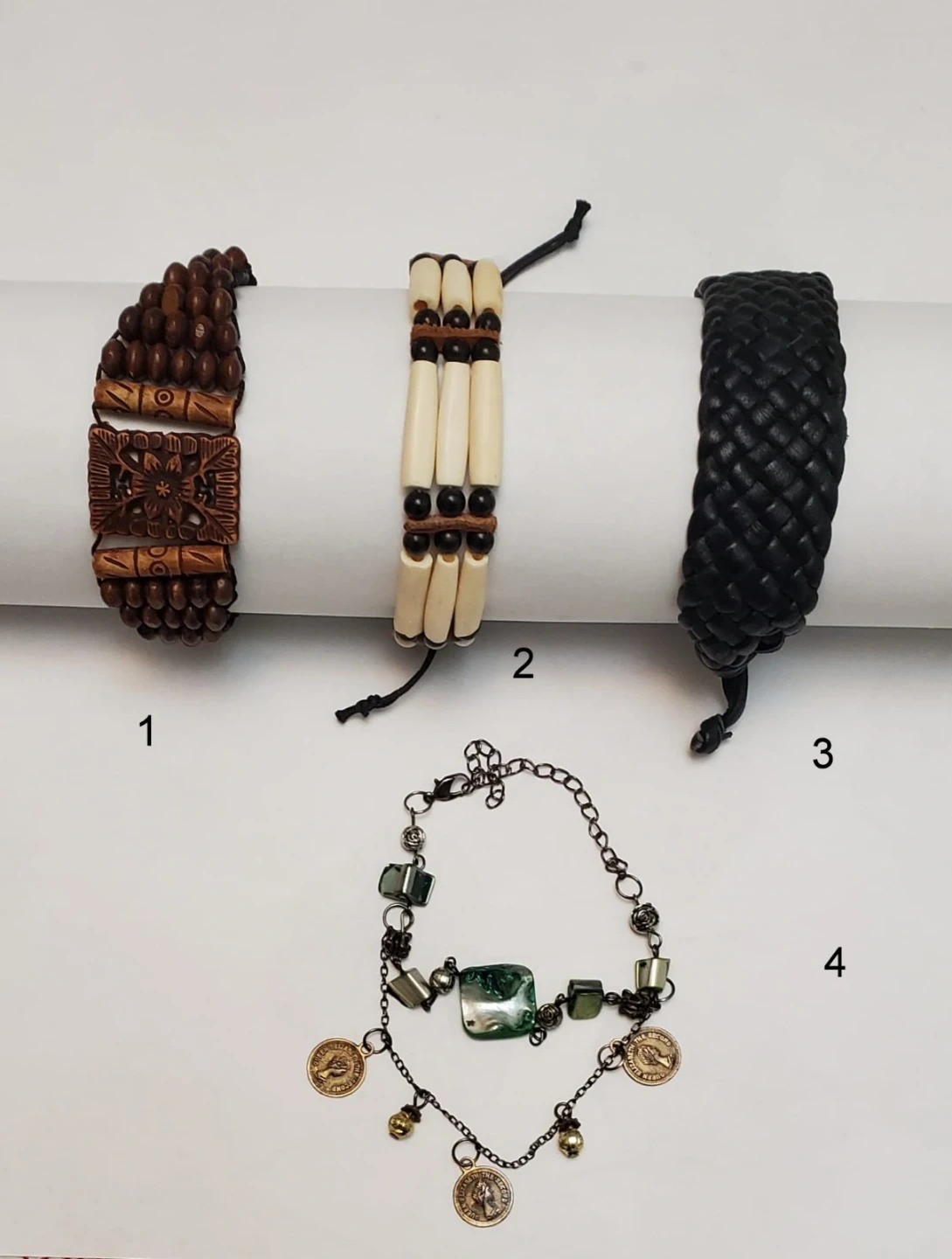 Includes a brown wood beaded bracelet with carved accents, a black braided leather bracelet, a bone and black bead bracelet, and a dark metal chain bracelet with green shell and coin charms. These bracelets offer a variety of styles for everyday wear.