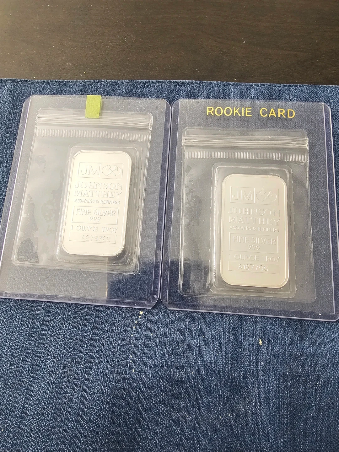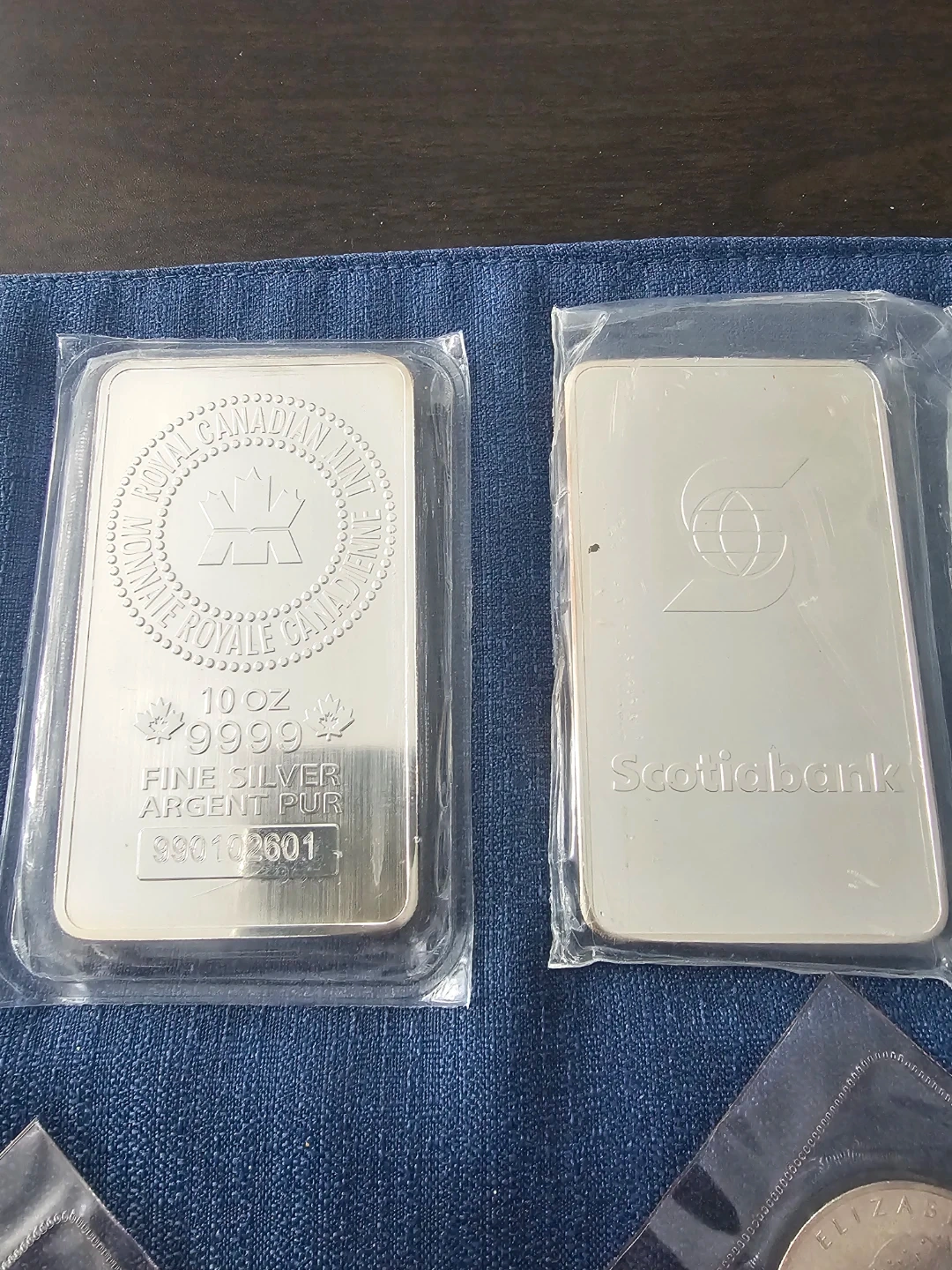 2 bars 10 oz each,2 bars 1 oz each,3 maples including a rare one,one morgan silver dollar, a little shy of 26 oz in total(25 oz 26.73 gms ) ,price is firm and selling everything altogether only,meet at a police station or a public place ,pickup is hurontario and wanless Bramptonim asking 1650 each for the two 10 oz bars,167 each for the JM bars,165 each for the 3 maples including the rare maple and again 170 for the Morgan silver $.