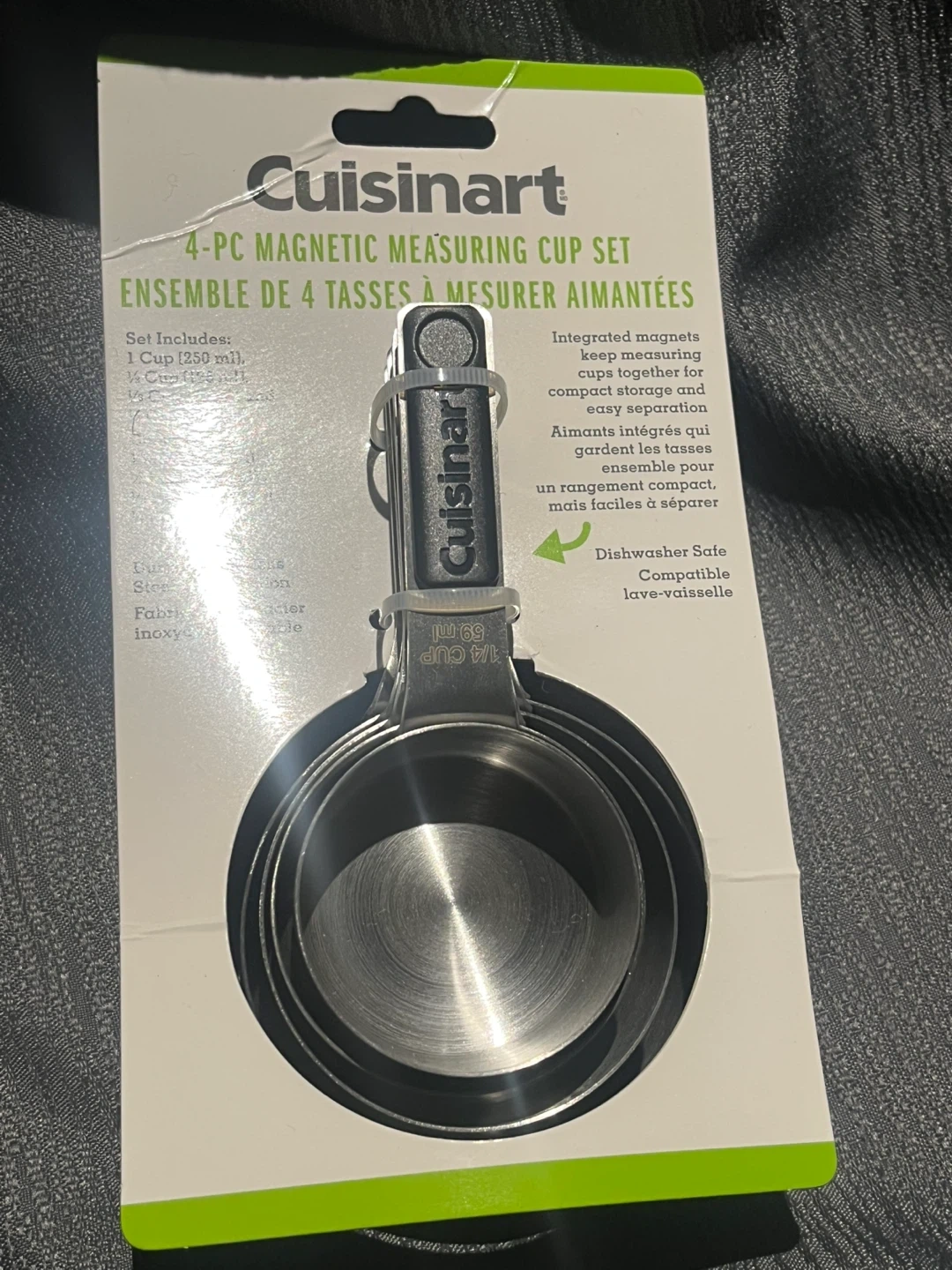 1000+Selling a brand new Cuisinart 4-piece magnetic measuring cup set! Integrated magnets keep measuring cups together for compact storage and easy separation. Dishwasher safe, too! Set includes: 1 Cup (250 mL), 1/2 Cup (125 mL), 1/3 Cup (80 mL), 1/4 Cup (60 mL)