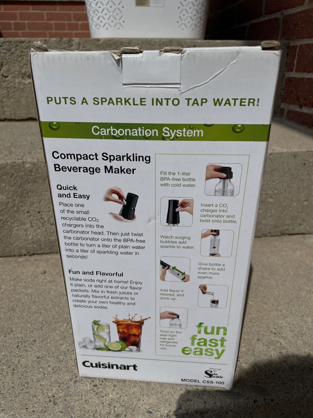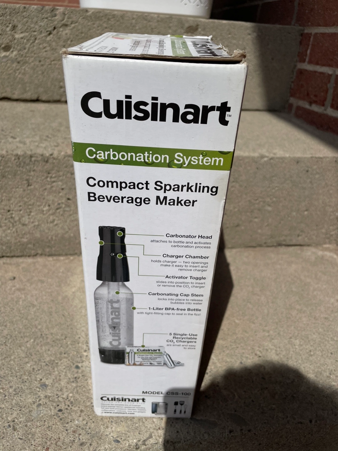 43Selling a Cuisinart Carbonation System, a compact sparkling beverage maker! It takes tap water and turns it into sparkling water in seconds. It's fun, quick, and easy to use with recyclable CO2 chargers. The system includes 5 chargers and a 1-liter BPA-free bottle. The compact system is portable and easy to store!