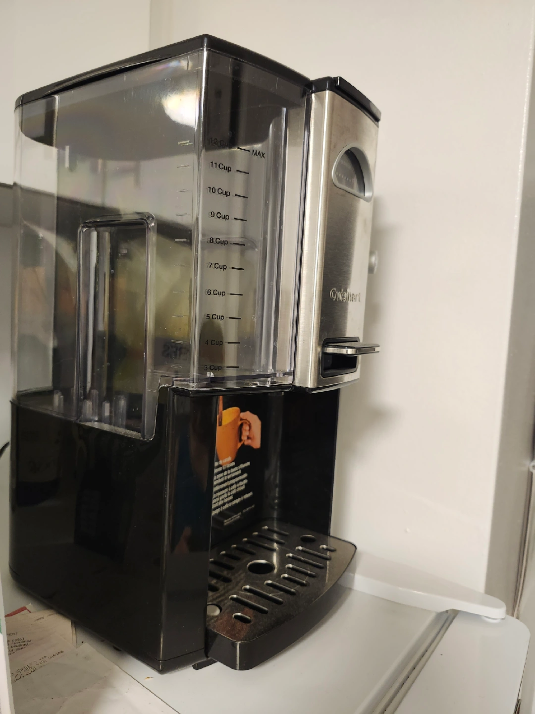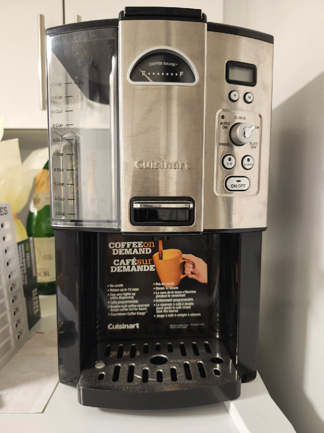 567I'm selling a Cuisinart coffee maker. It's in great condition and ready to make your mornings easier! It has a coffee gauge and is fully programmable. It can dispense one cup or multiple cups at a time. No carafe is needed, and it holds up to 12 cups