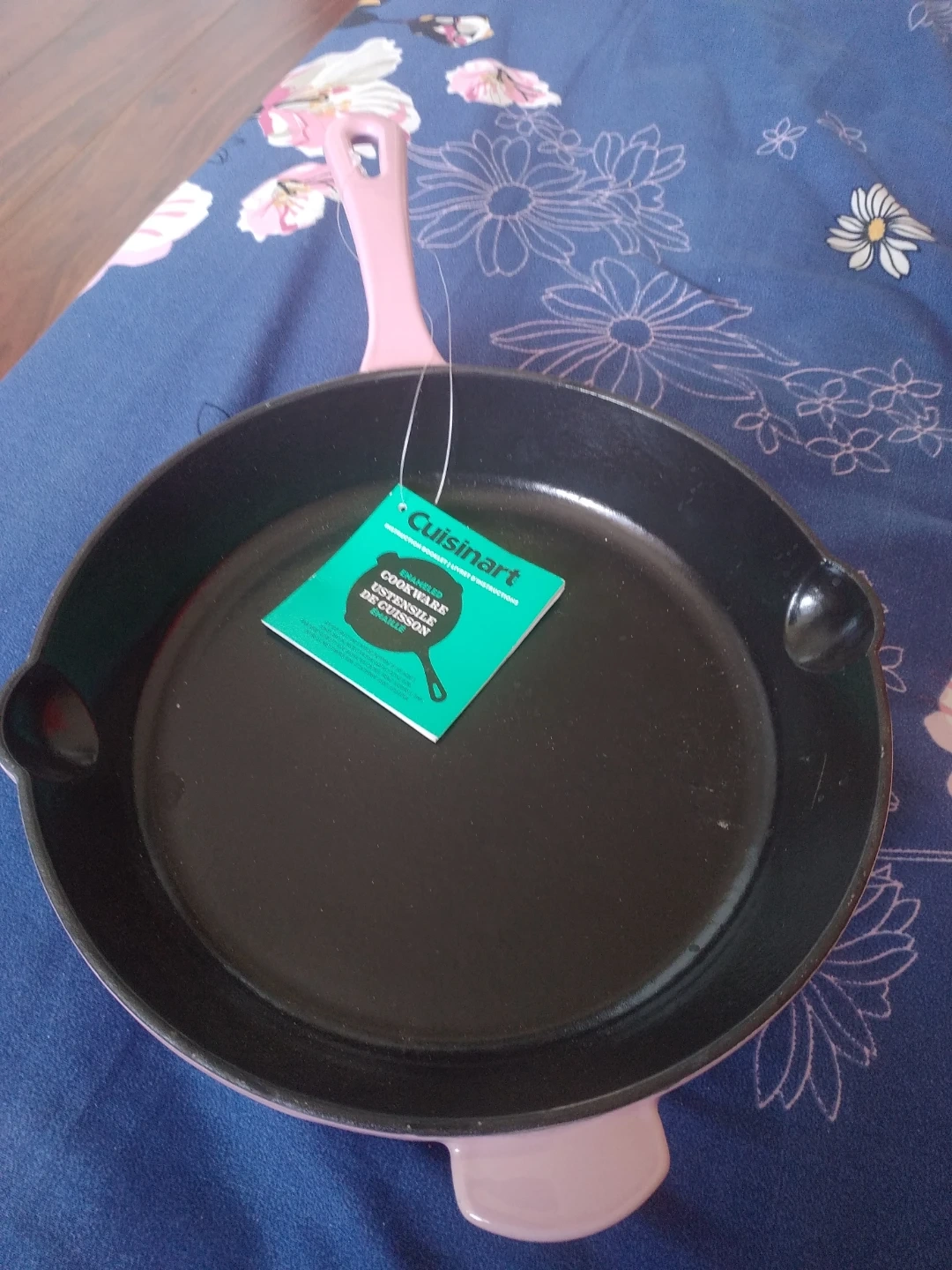 Pink enameled cast iron skillet. Great for stovetop cooking. New, never used.