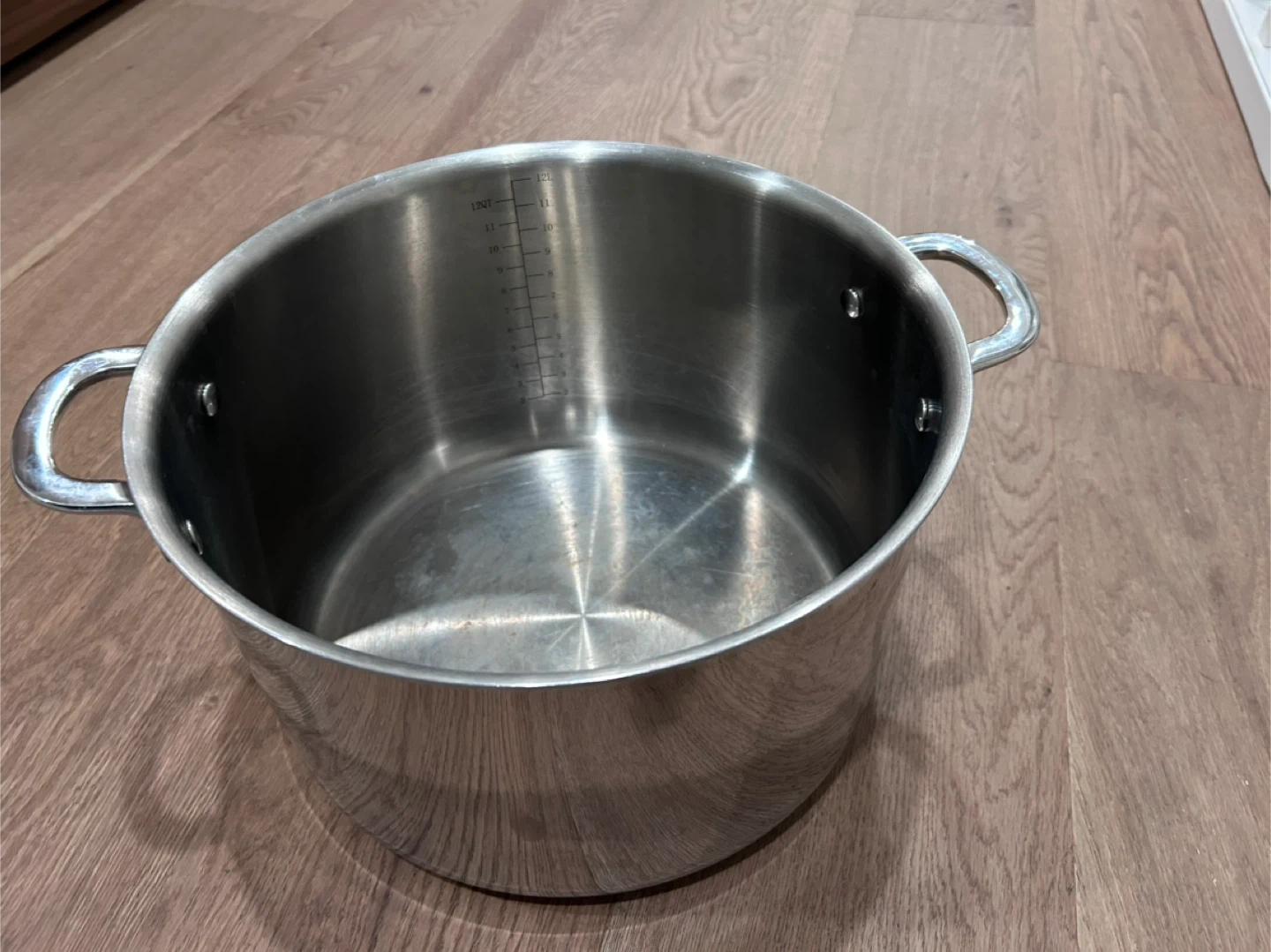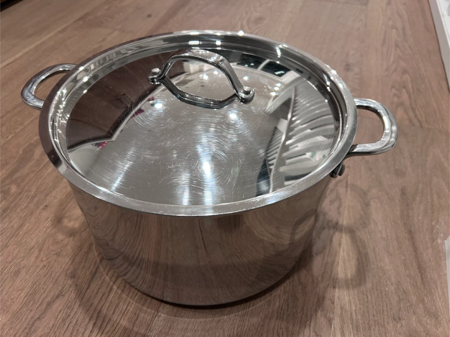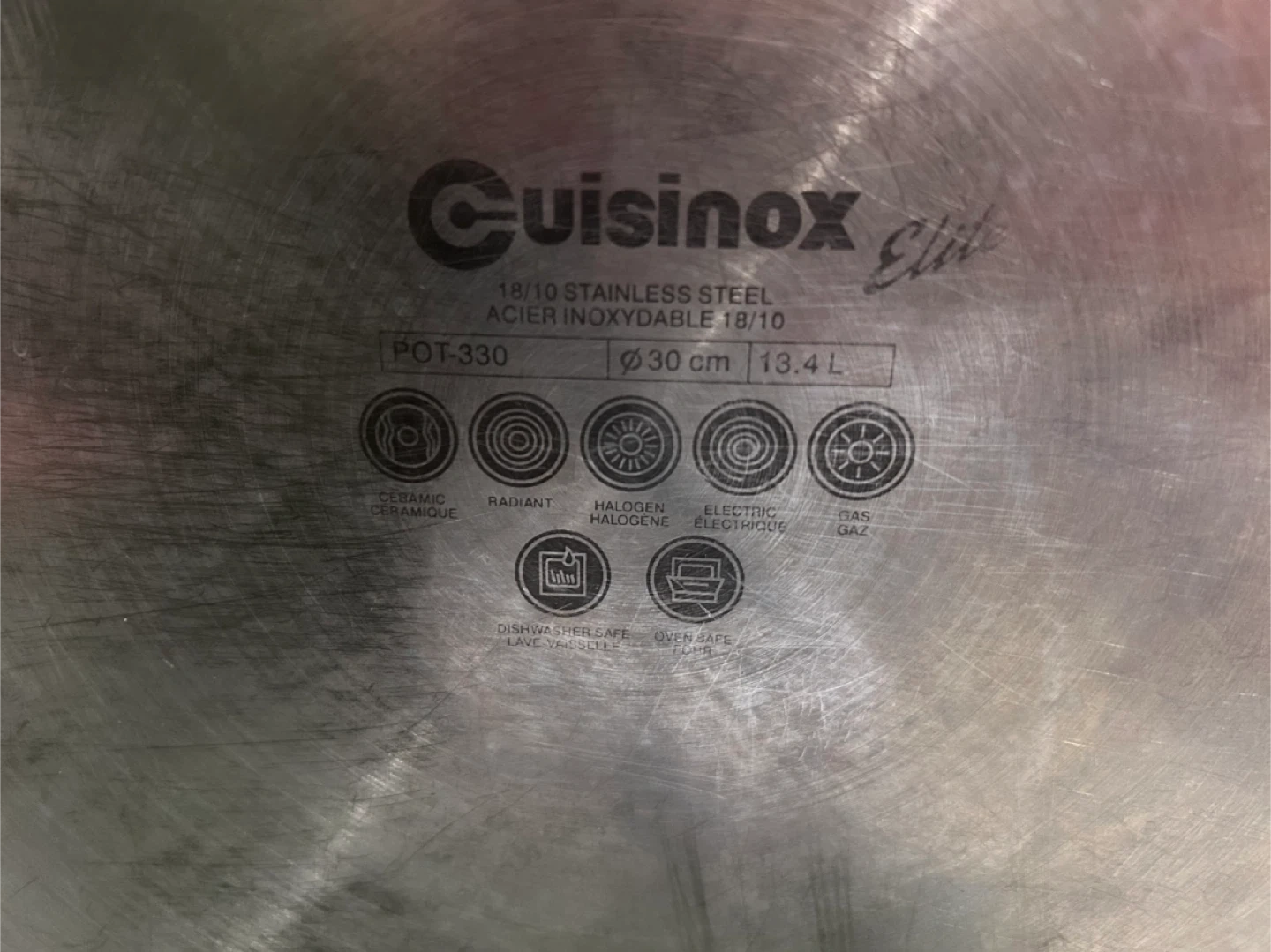 10Selling a Cuisinox Elite stock pot in good used condition. It's made of 18/10 stainless steel and has a capacity of 13.4 liters, or 12 quarts. It is suitable for ceramic, radiant, halogen, electric, and gas stovetops. It's also dishwasher and oven safe.