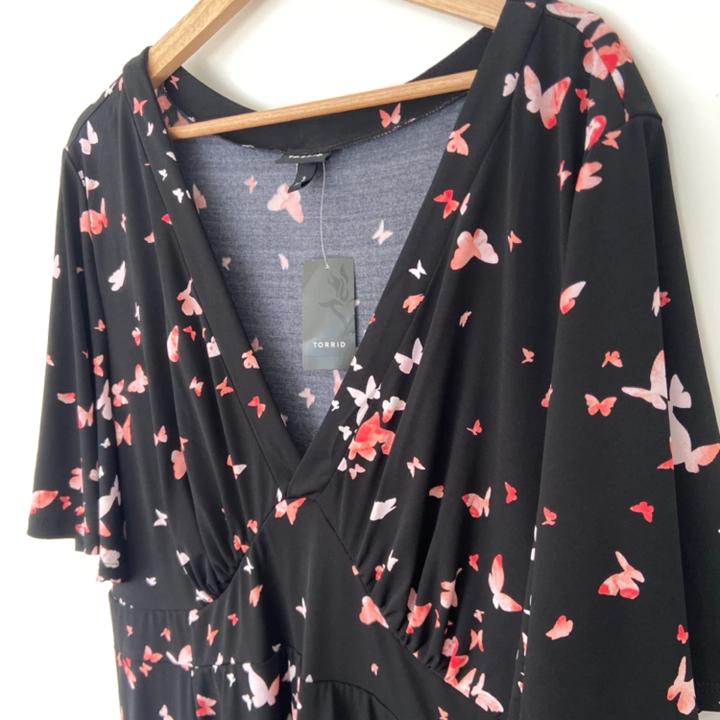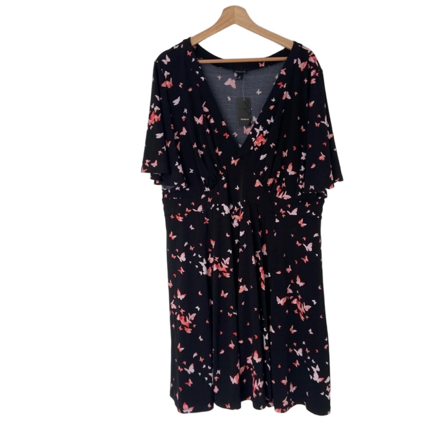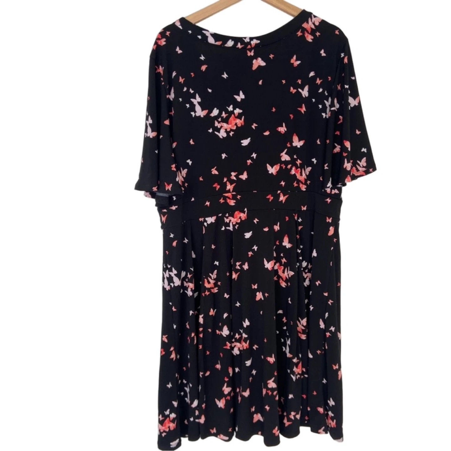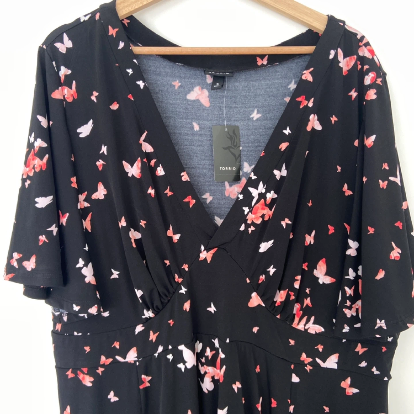 This Torrid dress has a black base with a charming all-over butterfly print in shades of pink and white. It features flutter sleeves and a flattering V-neckline. Perfect for adding a touch of whimsy to your wardrobe!