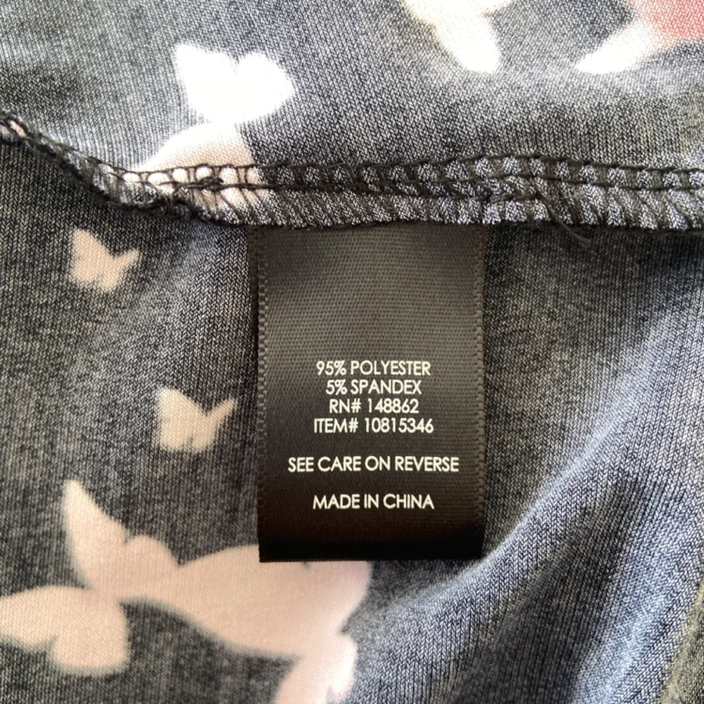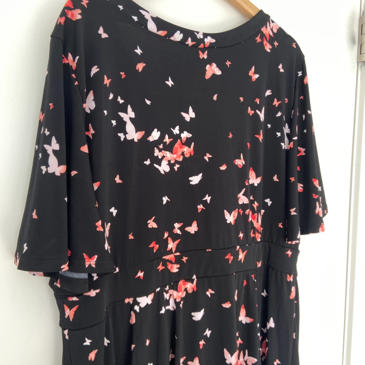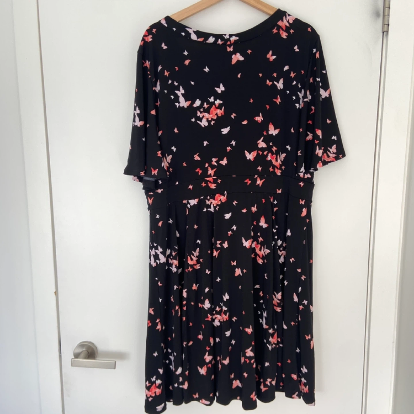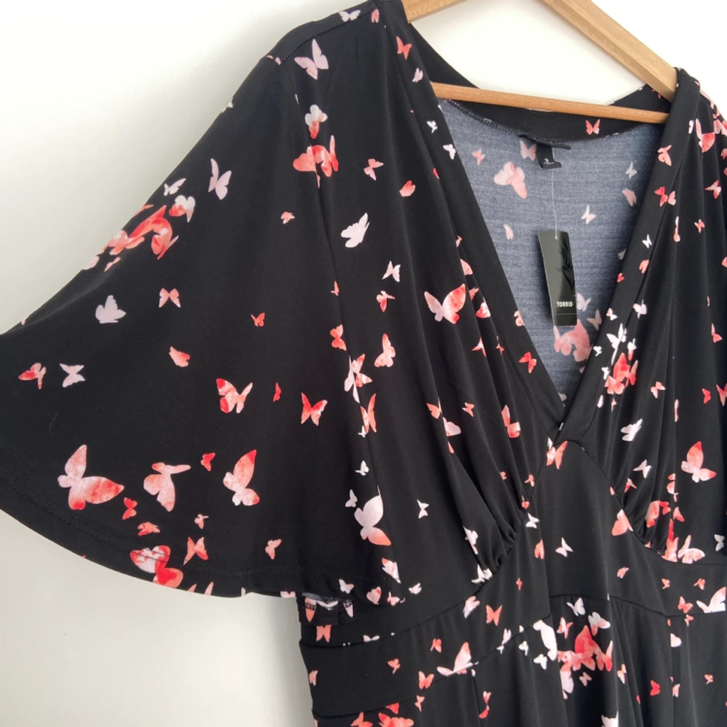 This Torrid dress has a black base with a charming all-over butterfly print in shades of pink and white. It features flutter sleeves and a flattering V-neckline. Perfect for adding a touch of whimsy to your wardrobe!
