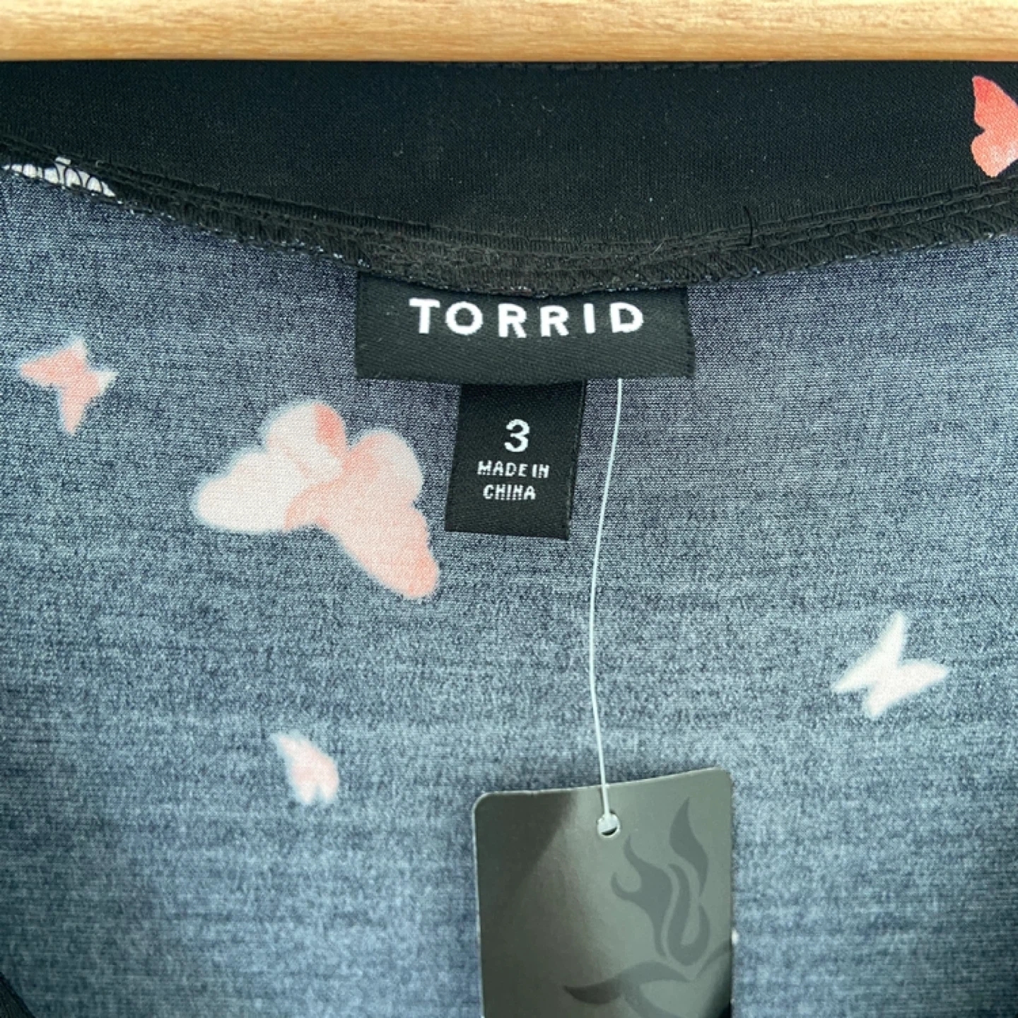 This Torrid dress has a black base with a charming all-over butterfly print in shades of pink and white. It features flutter sleeves and a flattering V-neckline. Perfect for adding a touch of whimsy to your wardrobe!