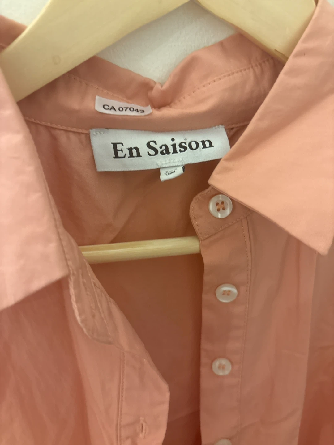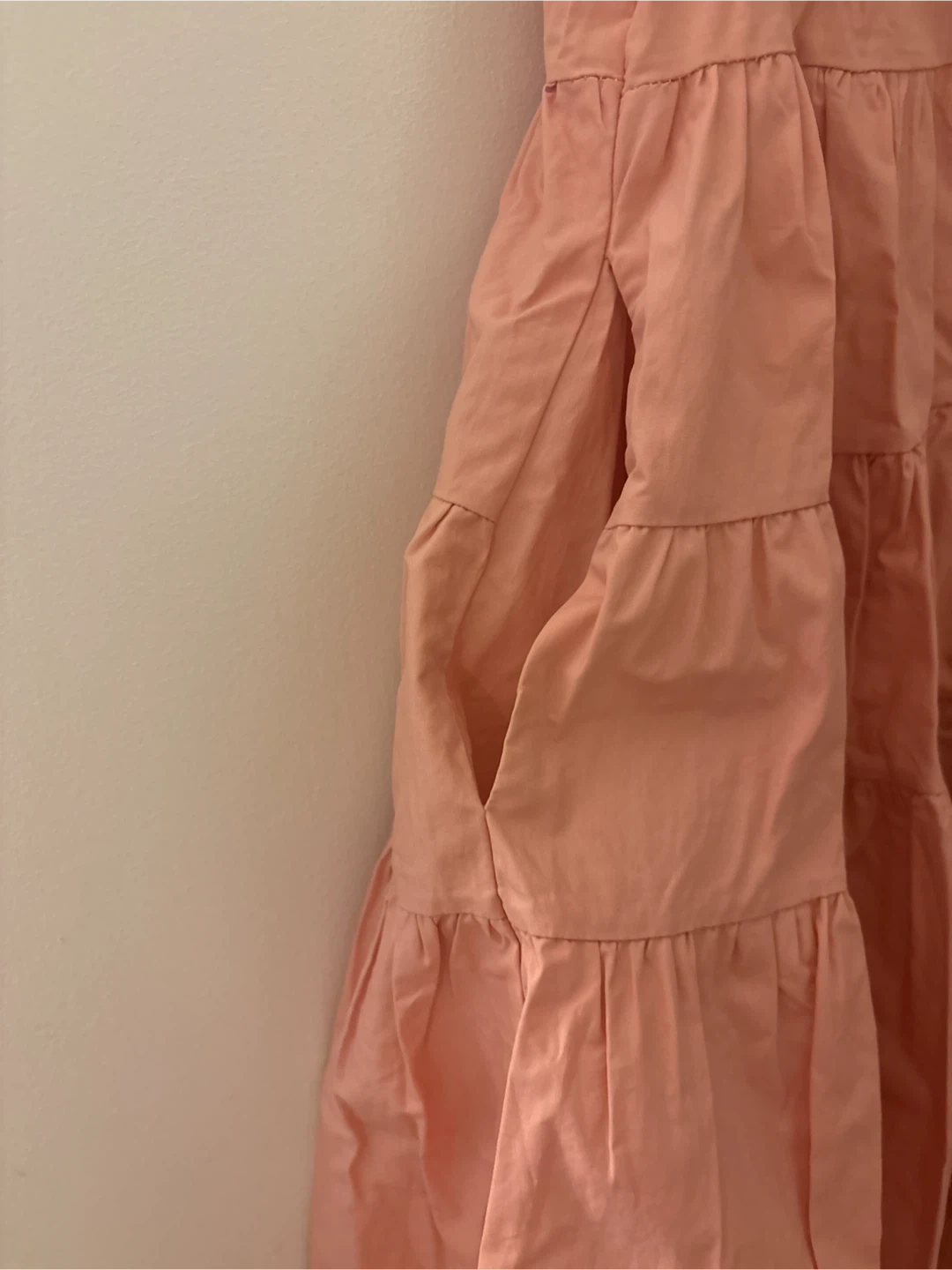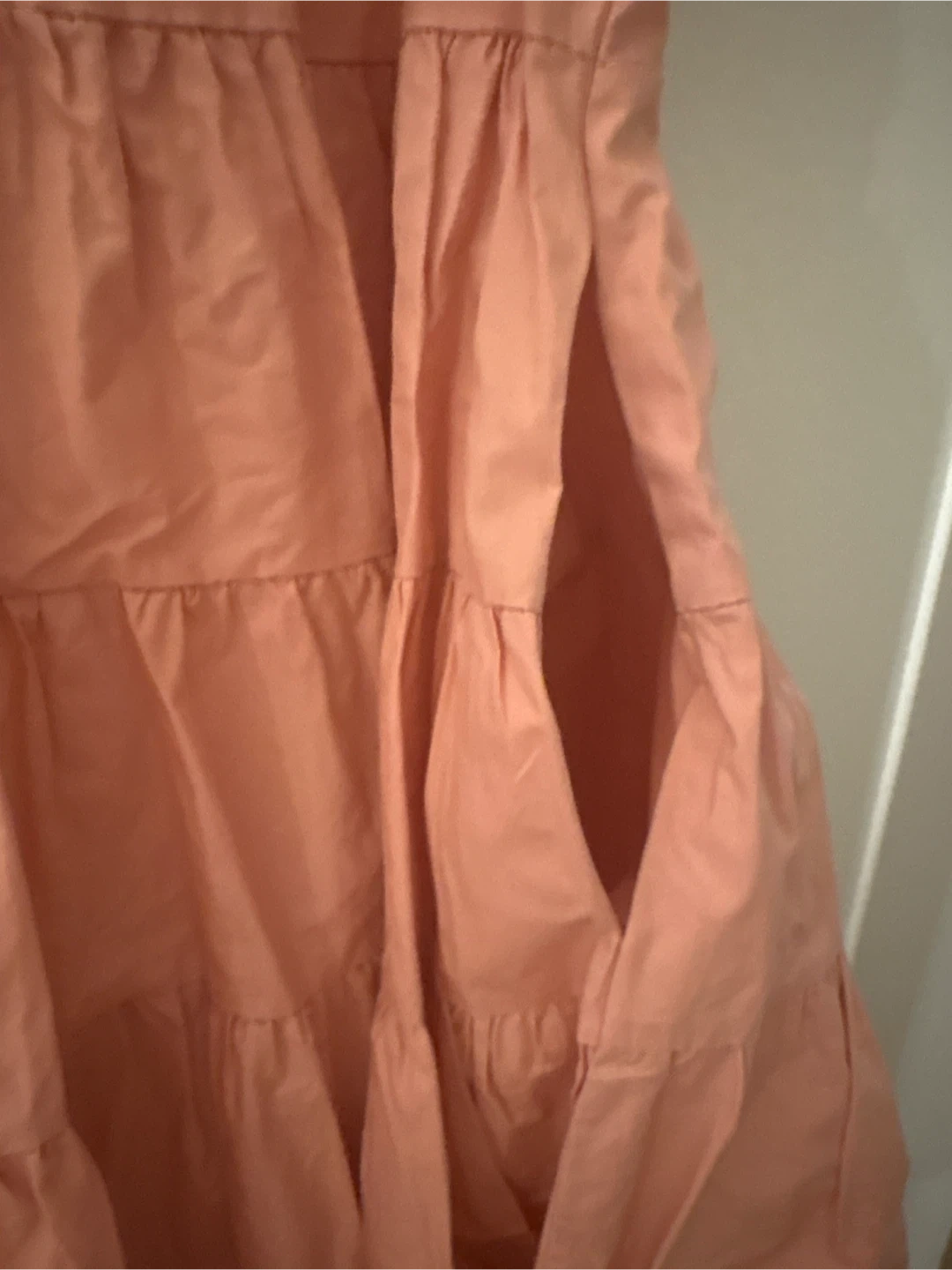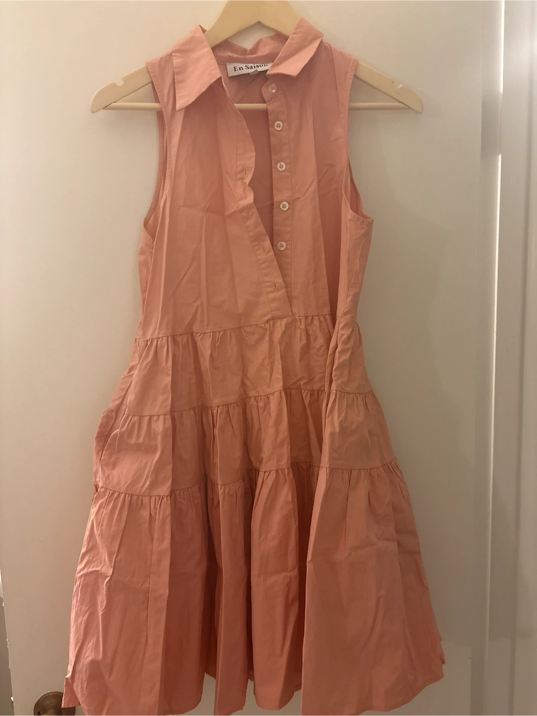 This En Saison dress is coral coloured and a size XS. It's a sleeveless, tiered dress with a button-up front and pockets. The material is lightweight and comfortable.