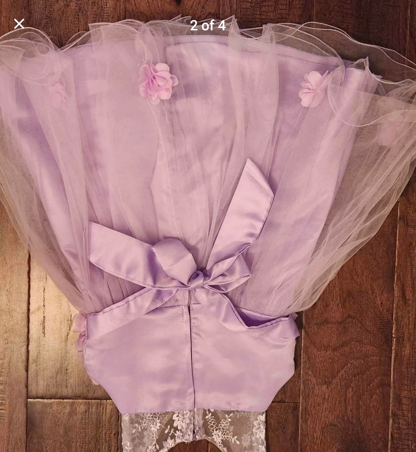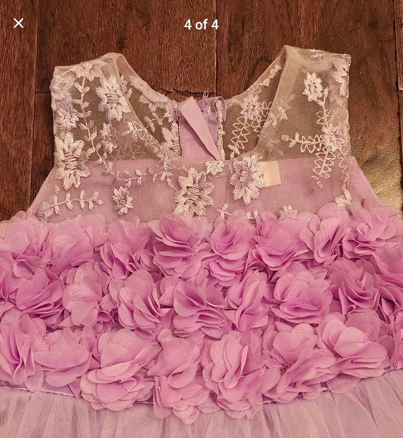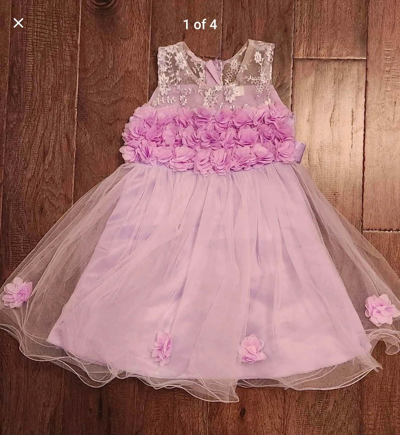 Selling a beautiful lilac flower girl dress! It features a lovely floral design on the bodice and skirt, with delicate tulle and satin accents. Perfect for a special occasion!