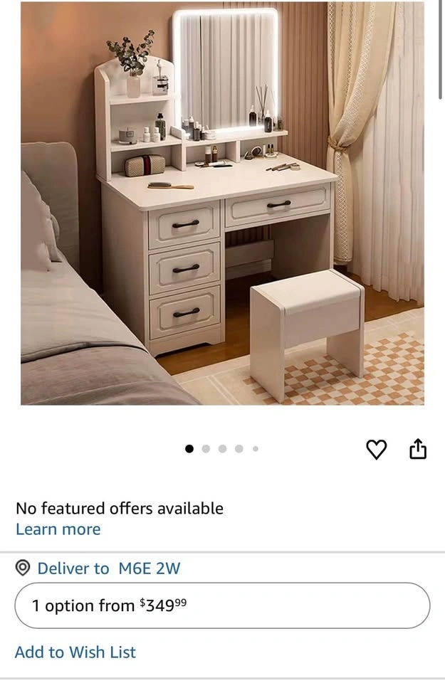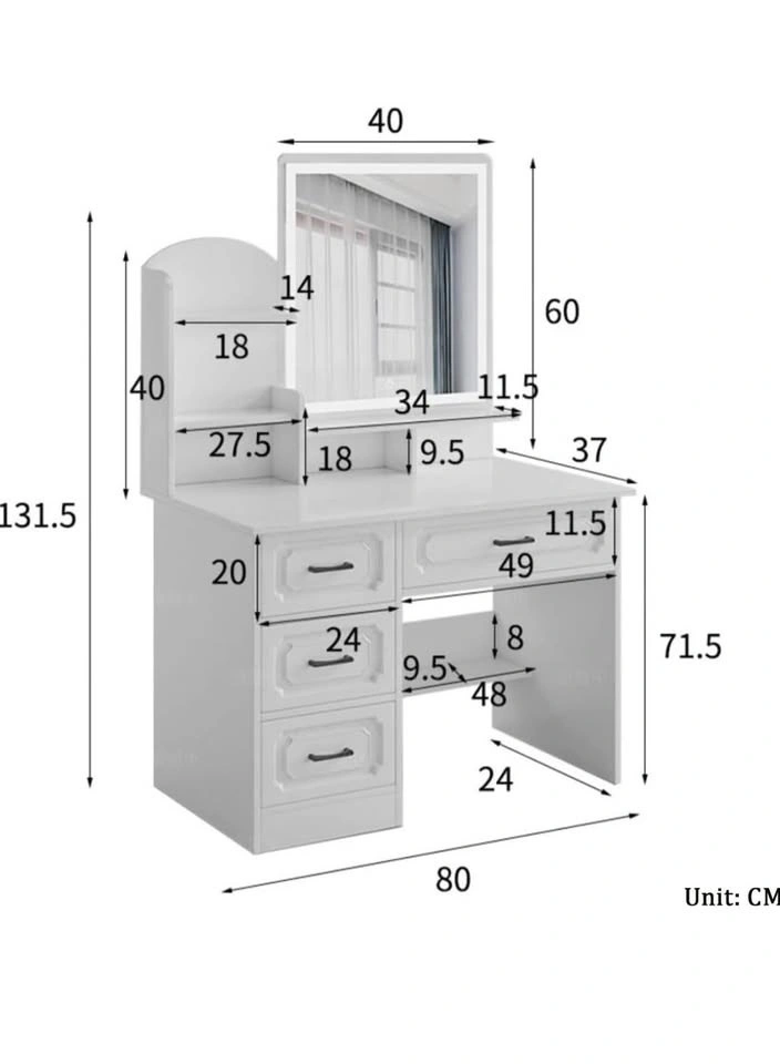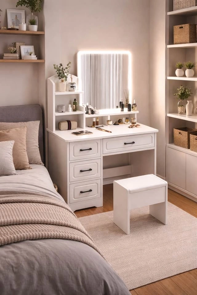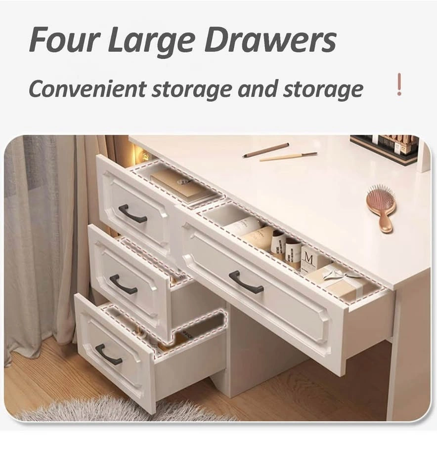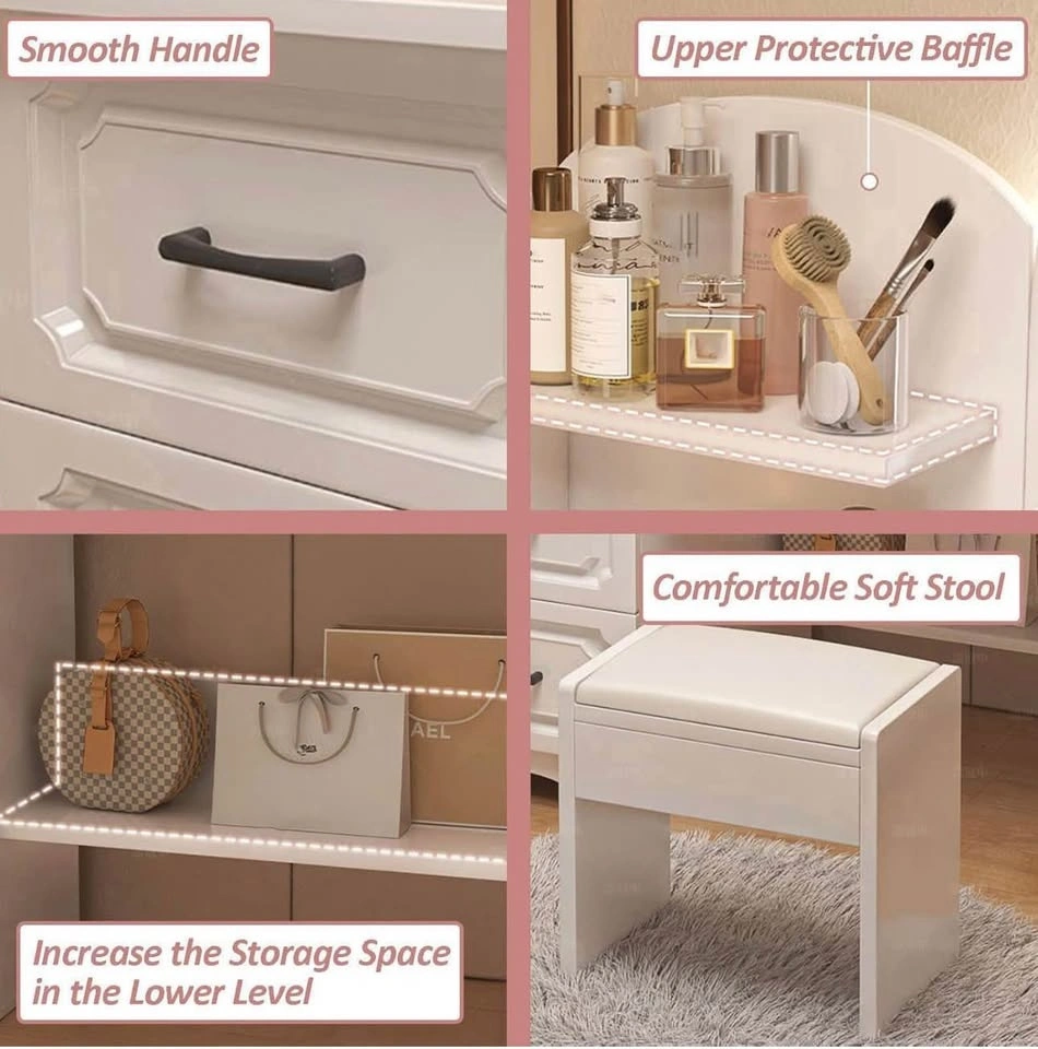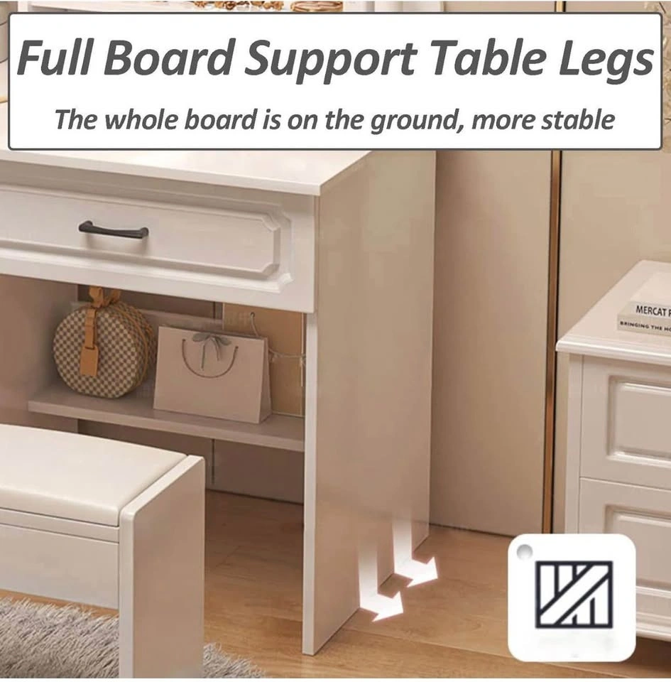 Modern White LED Vanity Desk w/ Mirror & Drawers/Stool