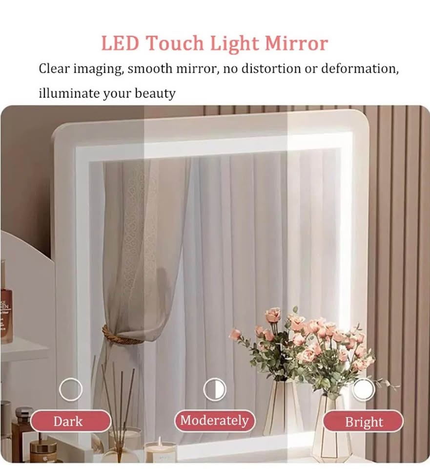 Beautiful modern white vanity / dressing table with a LED lighted square mirror featuring adjustable brightness and smart storage. A space-saving design that fits easily in bedrooms while still offering great functionality.