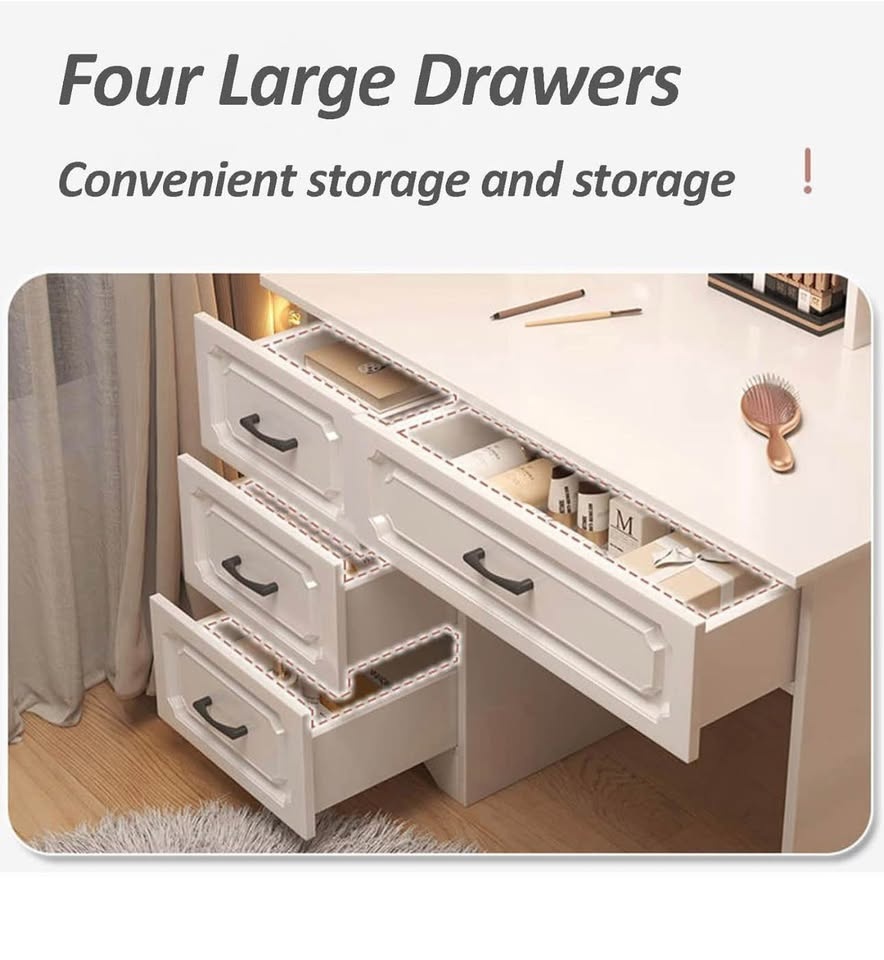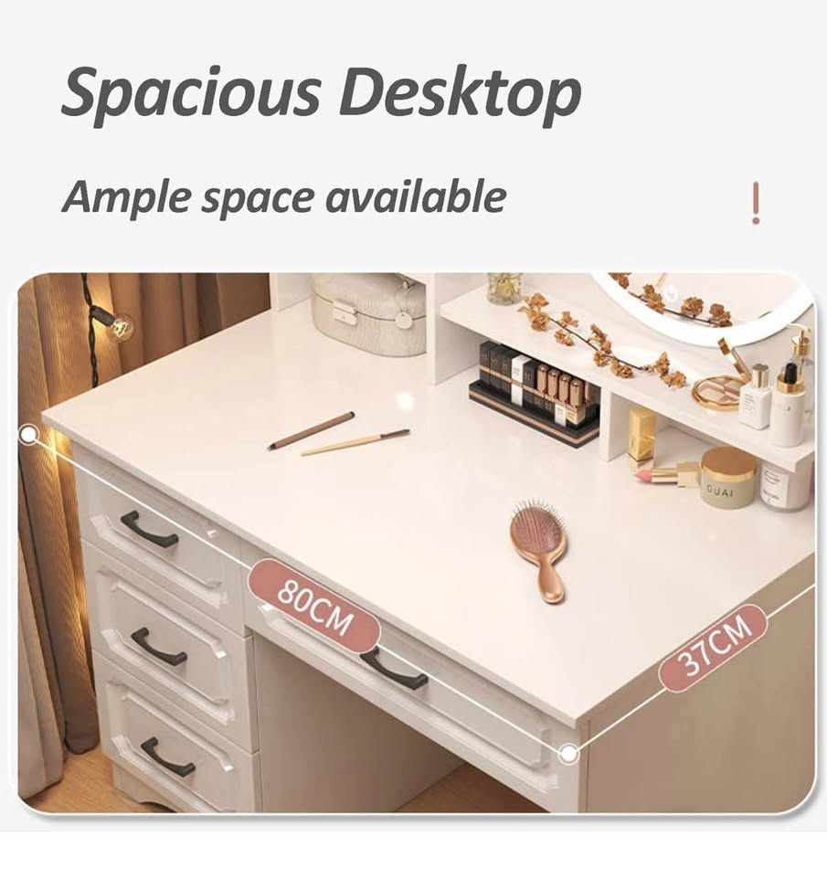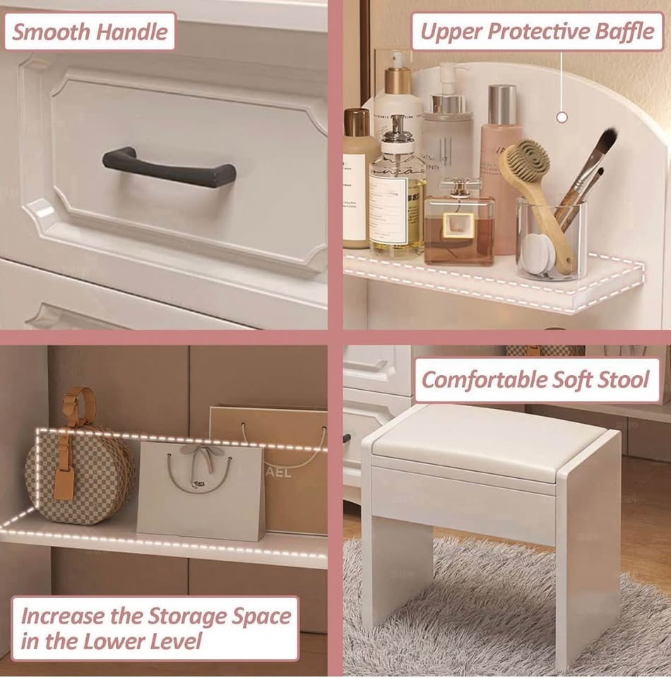 Modern White LED Vanity Desk w/ Mirror & Drawers/Stool