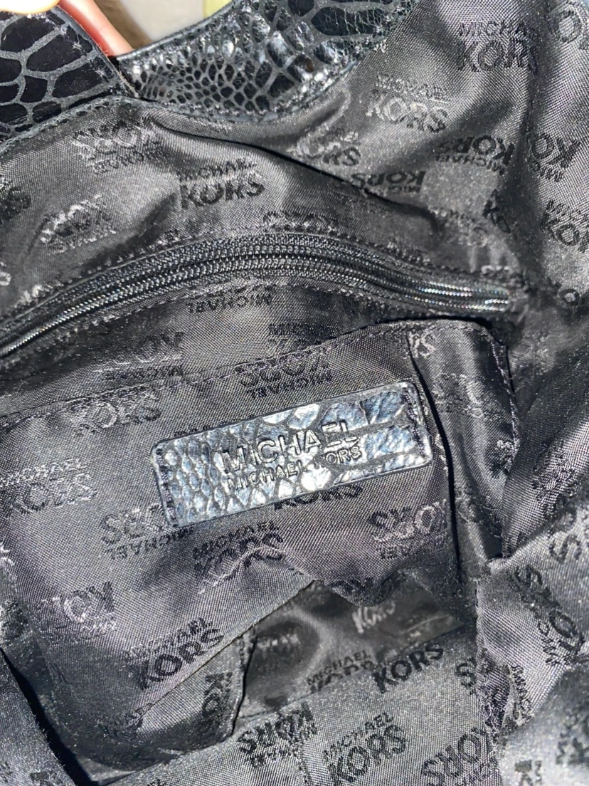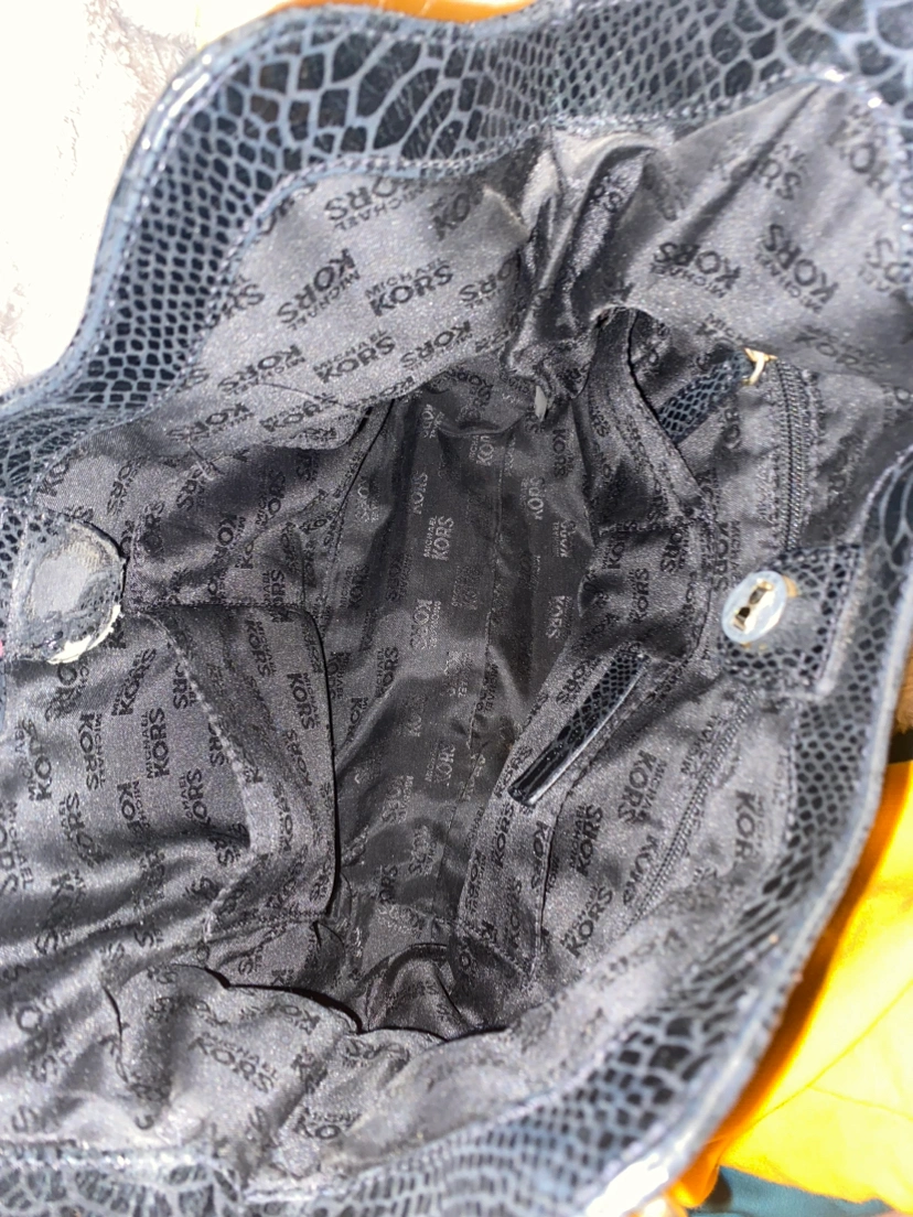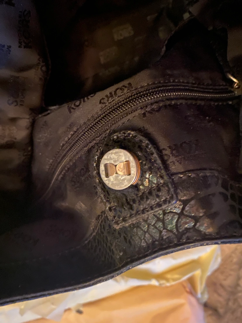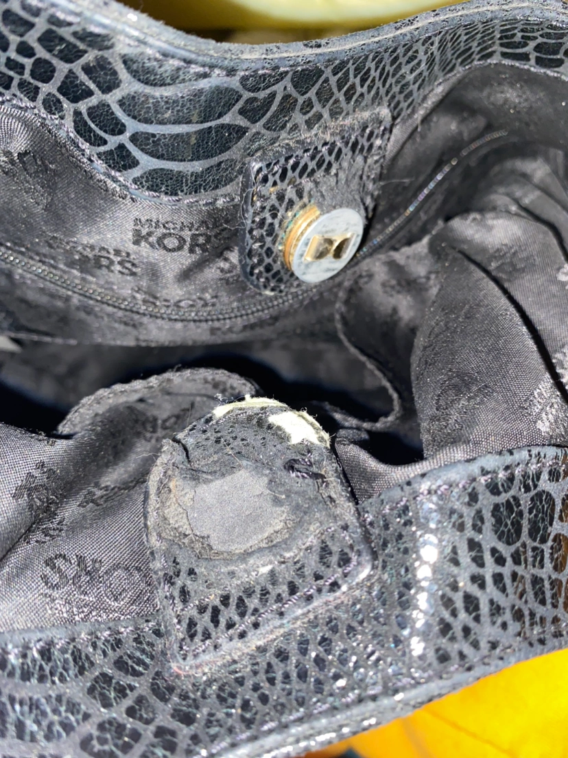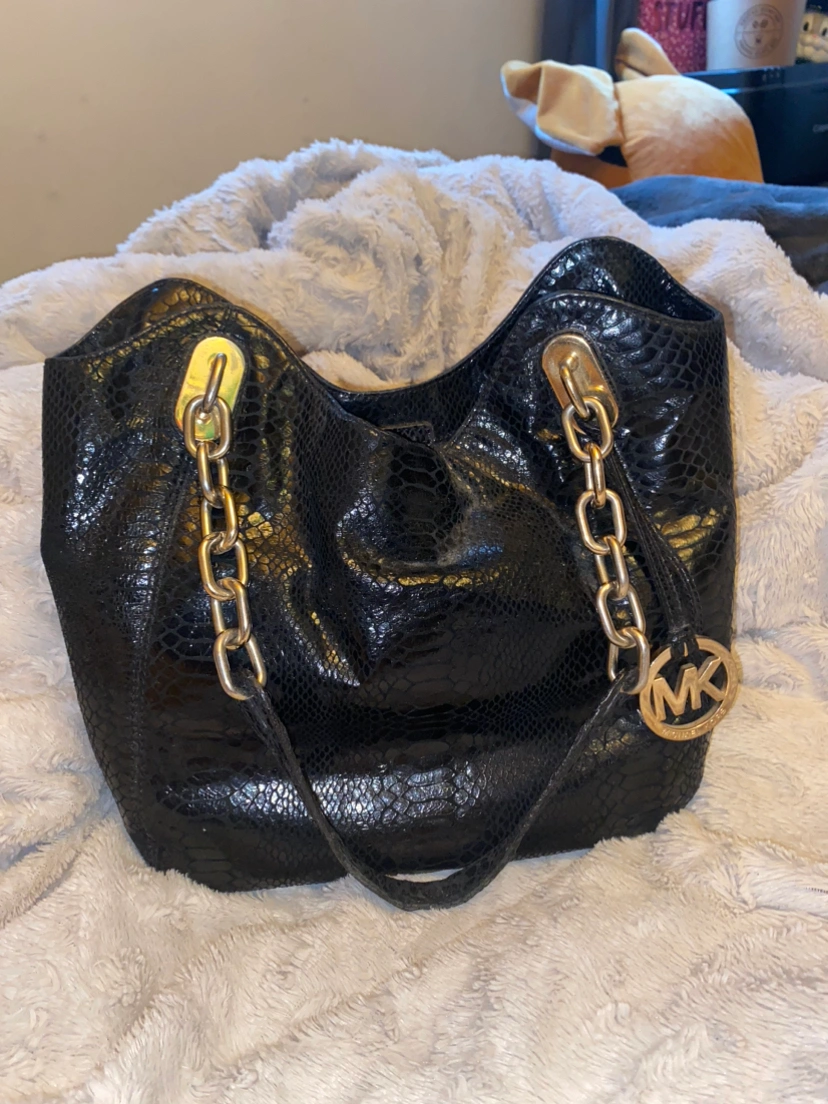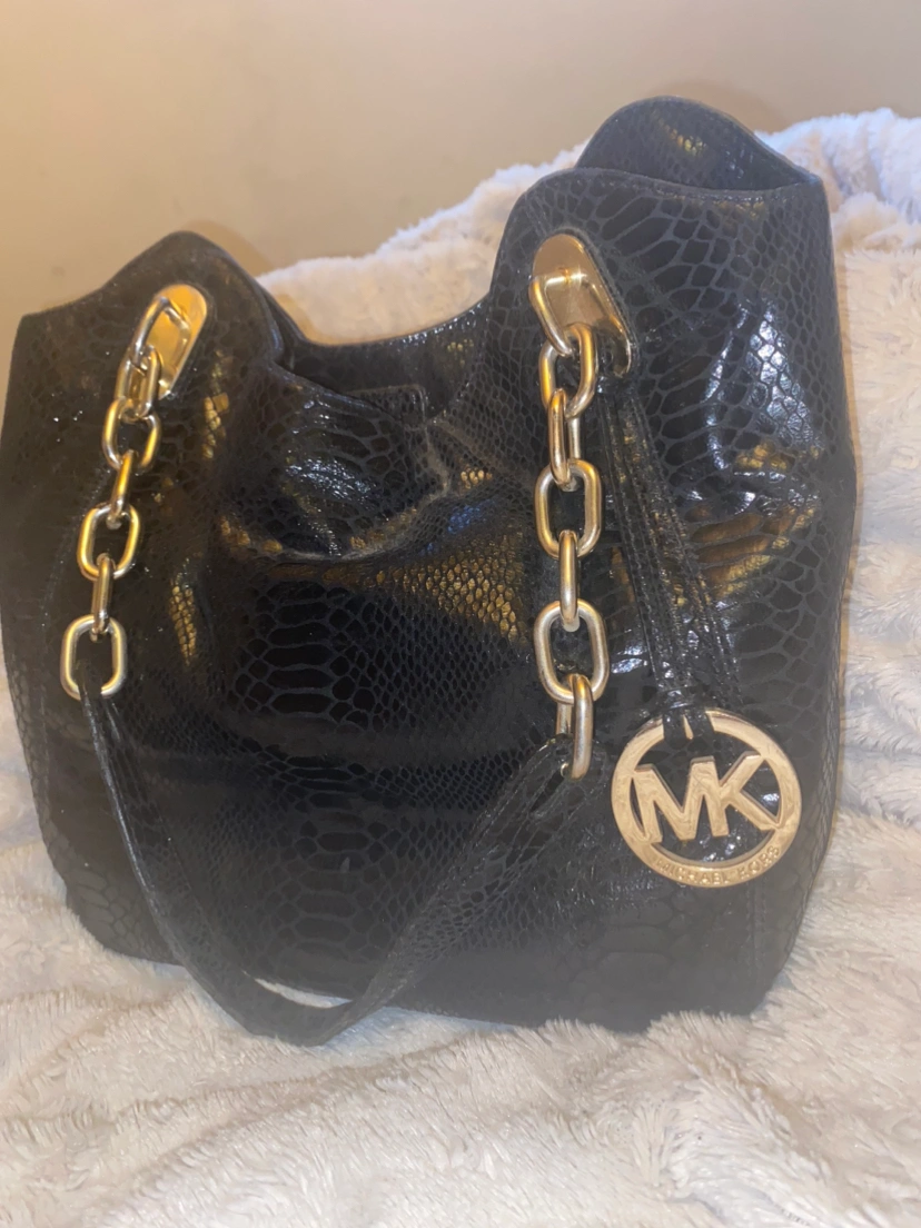 Black Micheal Kors bag. Older design with gold chain, one of the straps has green a stains on it, and as you can see the button clasps on the inside are damaged. But other than that it is okay, zipper works and the outside and inside of bag are in good condition. I’ve had no use for it and would rather give it to someone who would appreciate it more. Open to negotiations as well.