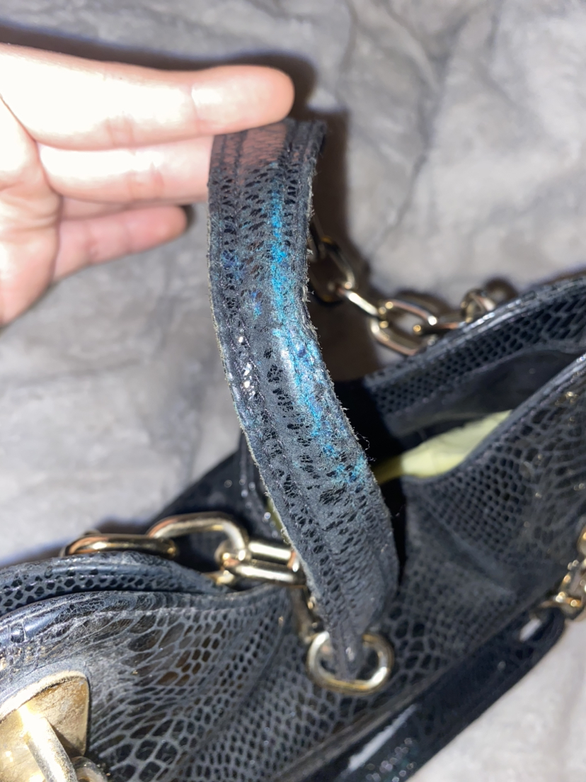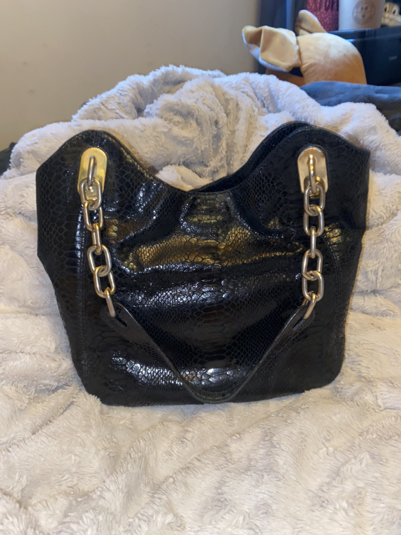 Black Micheal Kors bag. Older design with gold chain, one of the straps has green a stains on it, and as you can see the button clasps on the inside are damaged. But other than that it is okay, zipper works and the outside and inside of bag are in good condition. I’ve had no use for it and would rather give it to someone who would appreciate it more. Open to negotiations as well.