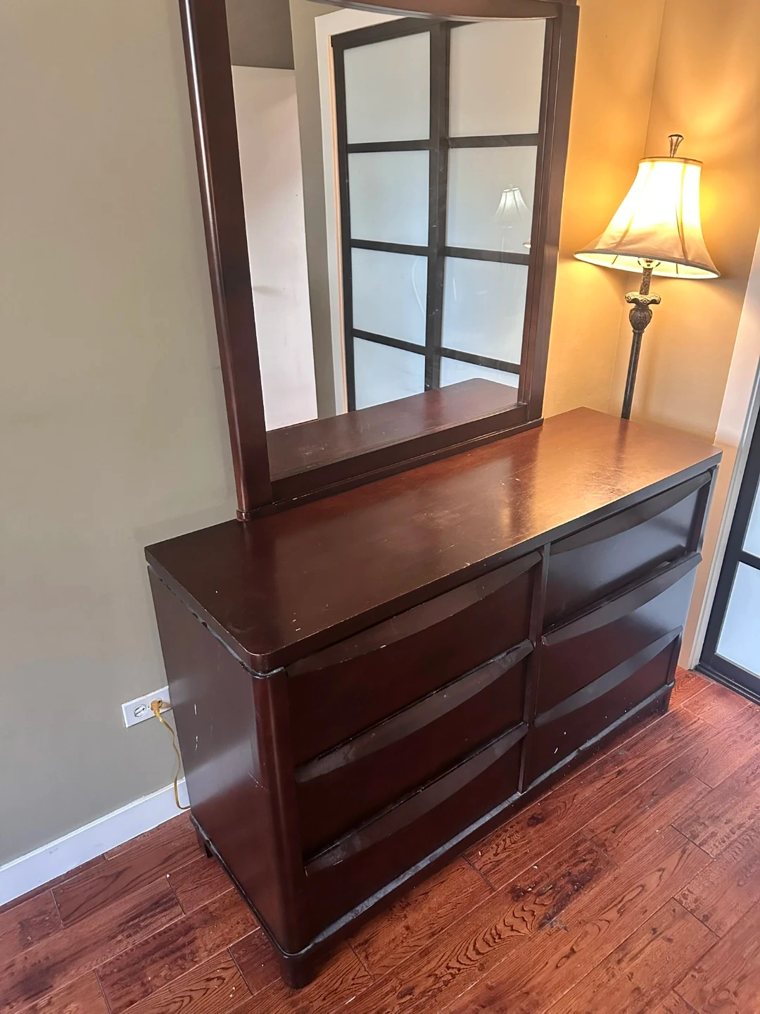 This dresser has six drawers and a large attached mirror. It's a dark brown wood. It's a solid piece for bedroom storage.