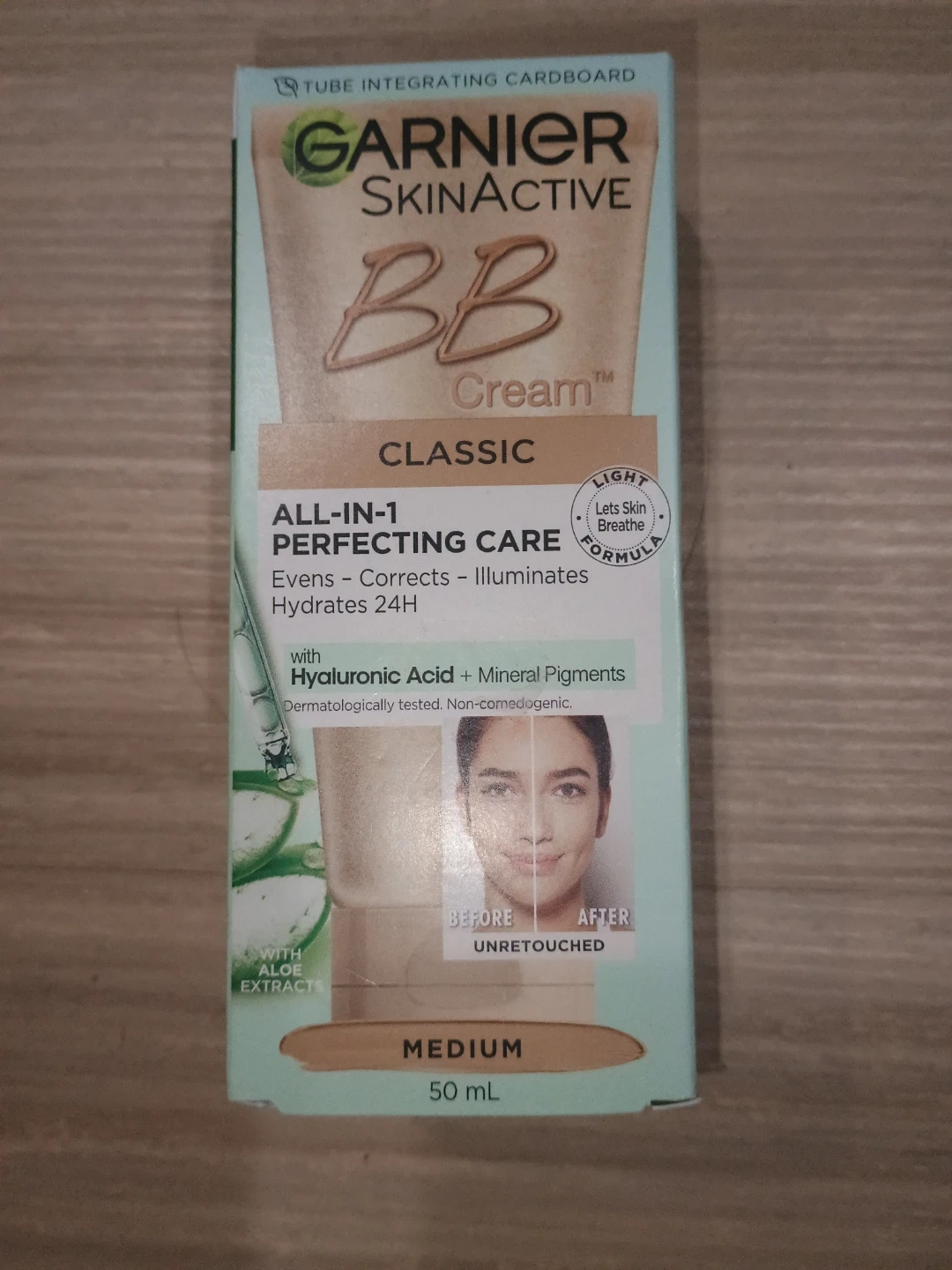 Unopened Garnier BB cream offers all-in-1 perfecting care, evens, corrects, and illuminates. It's formulated with Hyaluronic Acid, Mineral Pigments, and Aloe Vera Extracts. The light texture hydrates for 24H. It's a medium shade, 50 mL size.