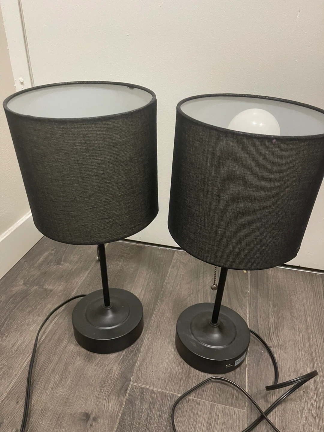 A pair of black fabric table lamps. Each lamp has a black metal base and stem with a black fabric drum shade. Bulb is not included. Perfect for adding ambient lighting to a bedroom or living room.