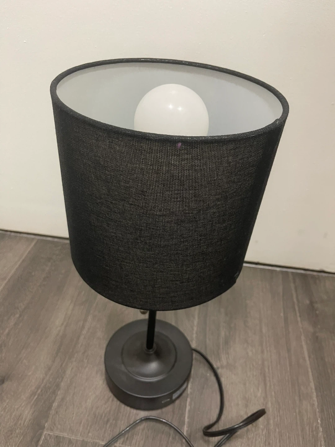 A pair of black fabric table lamps. Each lamp has a black metal base and stem with a black fabric drum shade. Bulb is not included. Perfect for adding ambient lighting to a bedroom or living room.