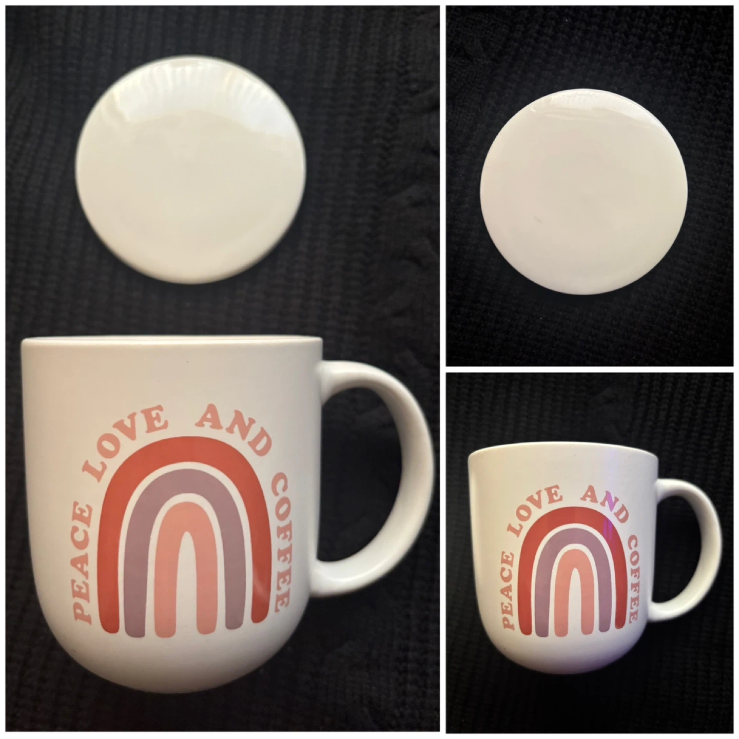 1000+Hi, For free is a cute mug with a lid that says "Peace Love And Coffee" with a rainbow design! It's in great condition and ready for your favourite warm beverage. Pick up only. (In Scarborough.) Thank you for your interest!